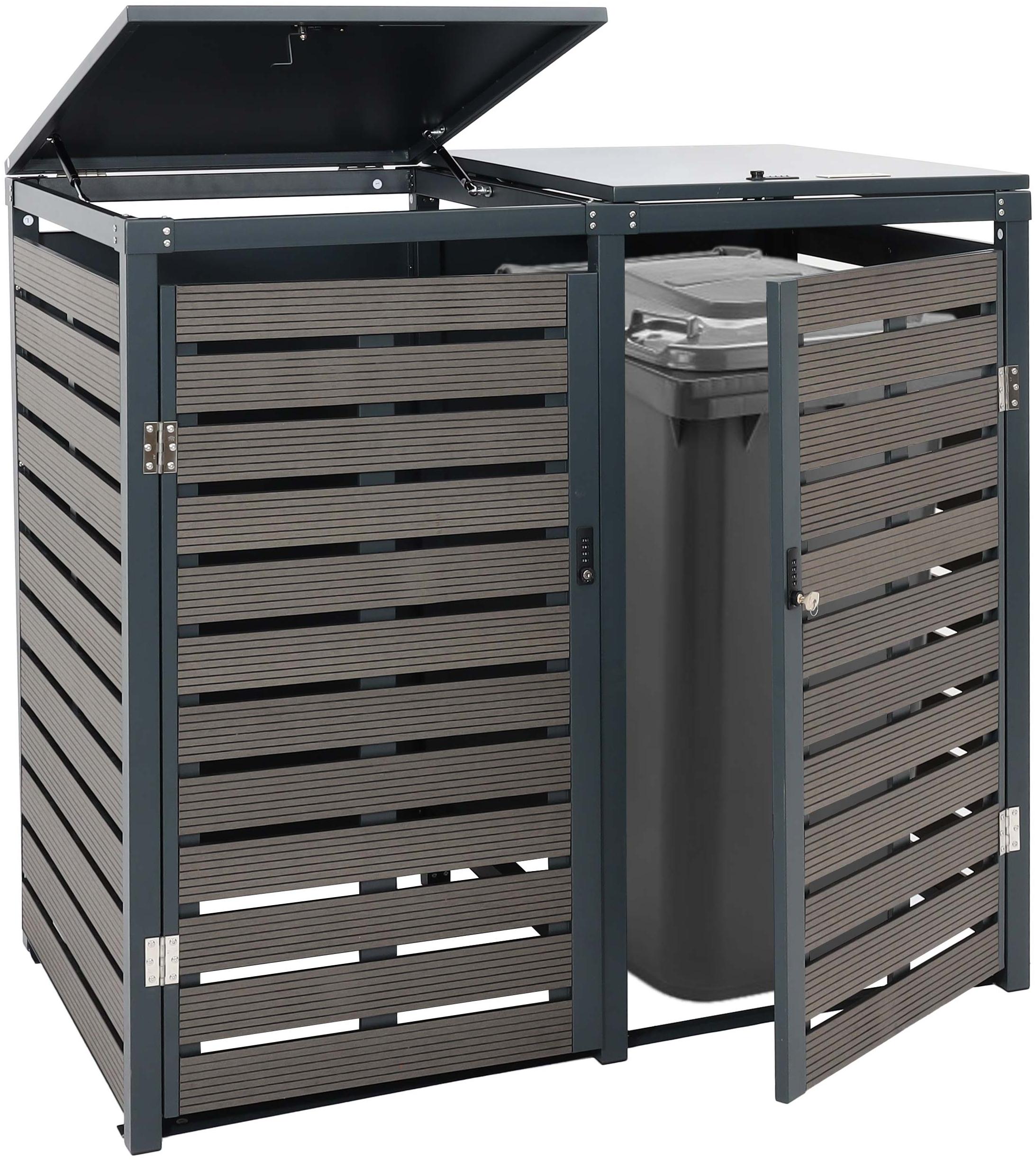 | Name | 2er Mülltonnenverkleidung HWC-K14, Mülltonnenbox Mülltonnenabdeckung, 119x134x84cm WPC Metall 78kg ~ anthrazit |
