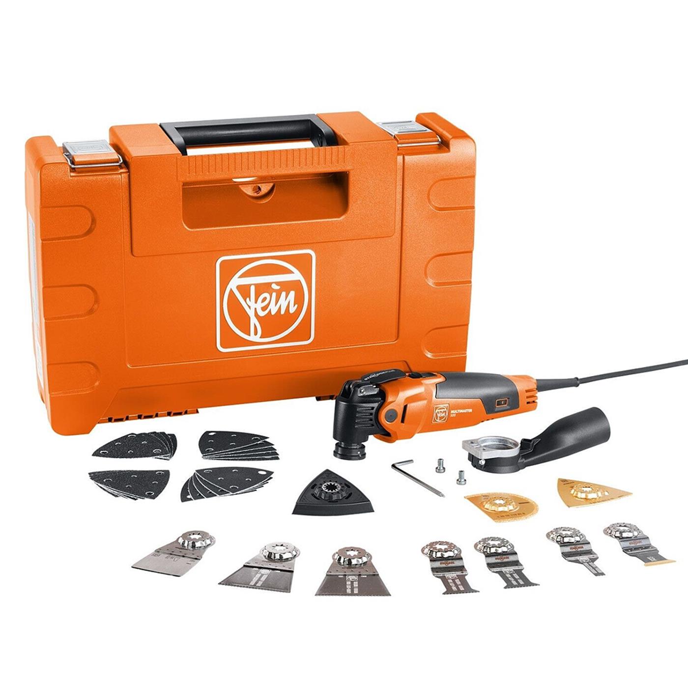 | Lieferumfang | 1 x Fein MultiMaster MM 500 PLUS Oszillierer - 1x Fein E-Cut Long-Life Sägeblatt 10 mm - 2x Fein E-Cut Long-Life Sägeblatt 35 mm - 2x Fein E-Cut Long-Life Sägeblatt 65 mm - 1x Fein E-Cut Long-Life Sägeblatt 32 mm - 1x Fein HM Sägeblatt Ø 75 mm - 1x Fein HM Raspel Dreieck - 20x Schleifblatt gelocht ( 5x K60 / 5x K80 / 5x K120 / 5x K180 ) - 1x Spachtel - 1x Schleifplatte gelocht - 1x Absaugvorrichtung - 1x Transportkoffer |