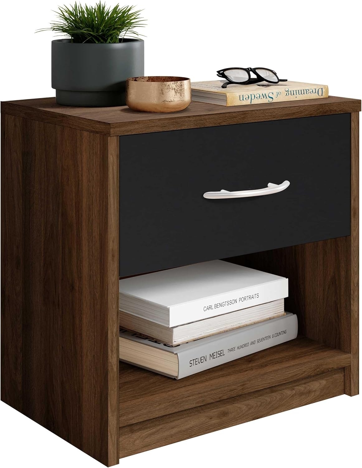 | Name | Stella Trading PEPE Nachttisch in Columbia Nussbaum Optik, Schwarz - Schlichter Nachtschrank mit einer Schublade passend zu jedem Bett & Schlafzimmer - 39 x 41 x 28 cm (B/H/T) |