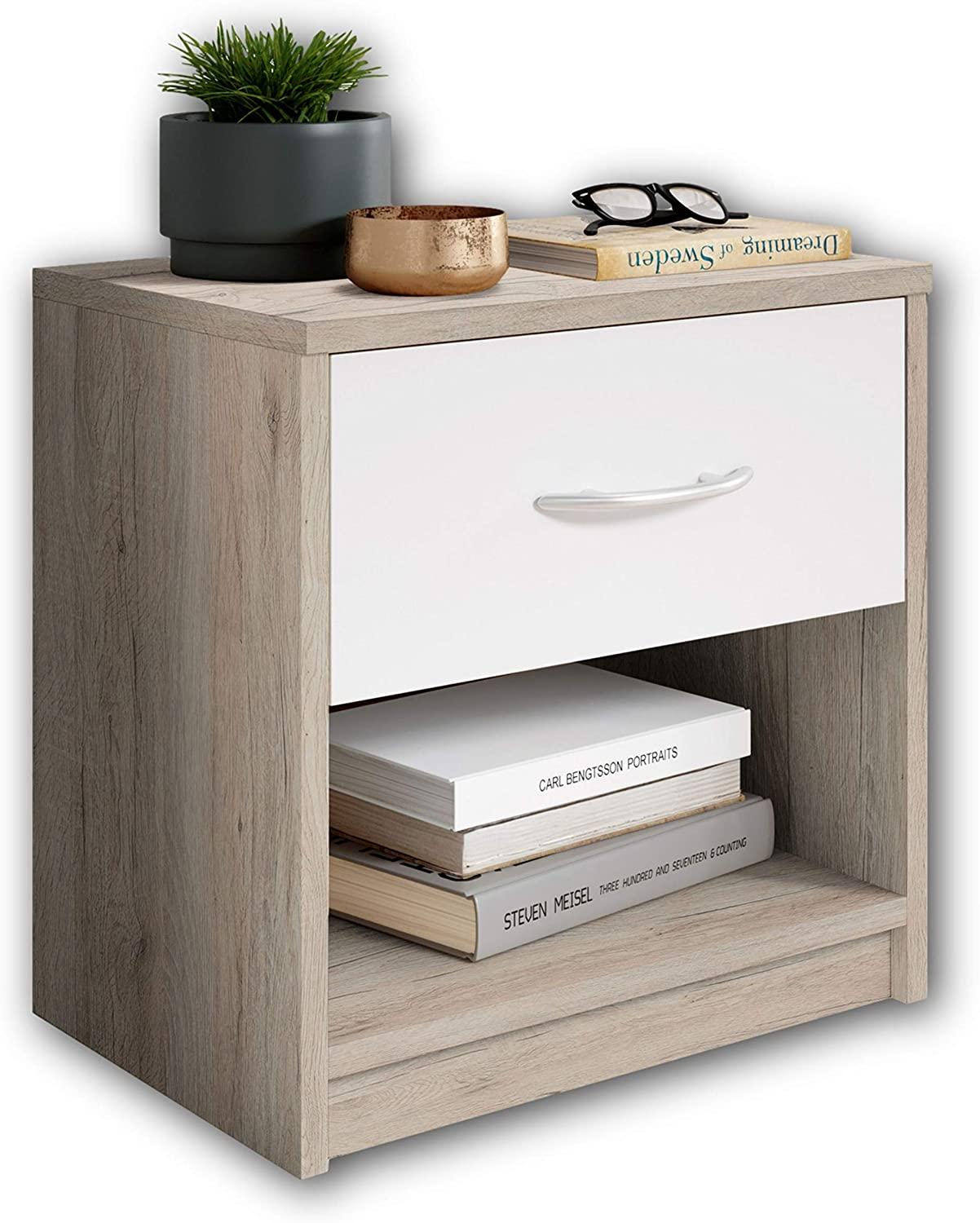 **Ausführung** Korpus: San Remo Holznachbildung Front: San Remo Holznachbildung mit einem Schubkasten in weiß **Ausstattung** 1 Schubkasten 1 offenes Fach **Lieferumfang** 1 Nachtkommode ohne Dekoration