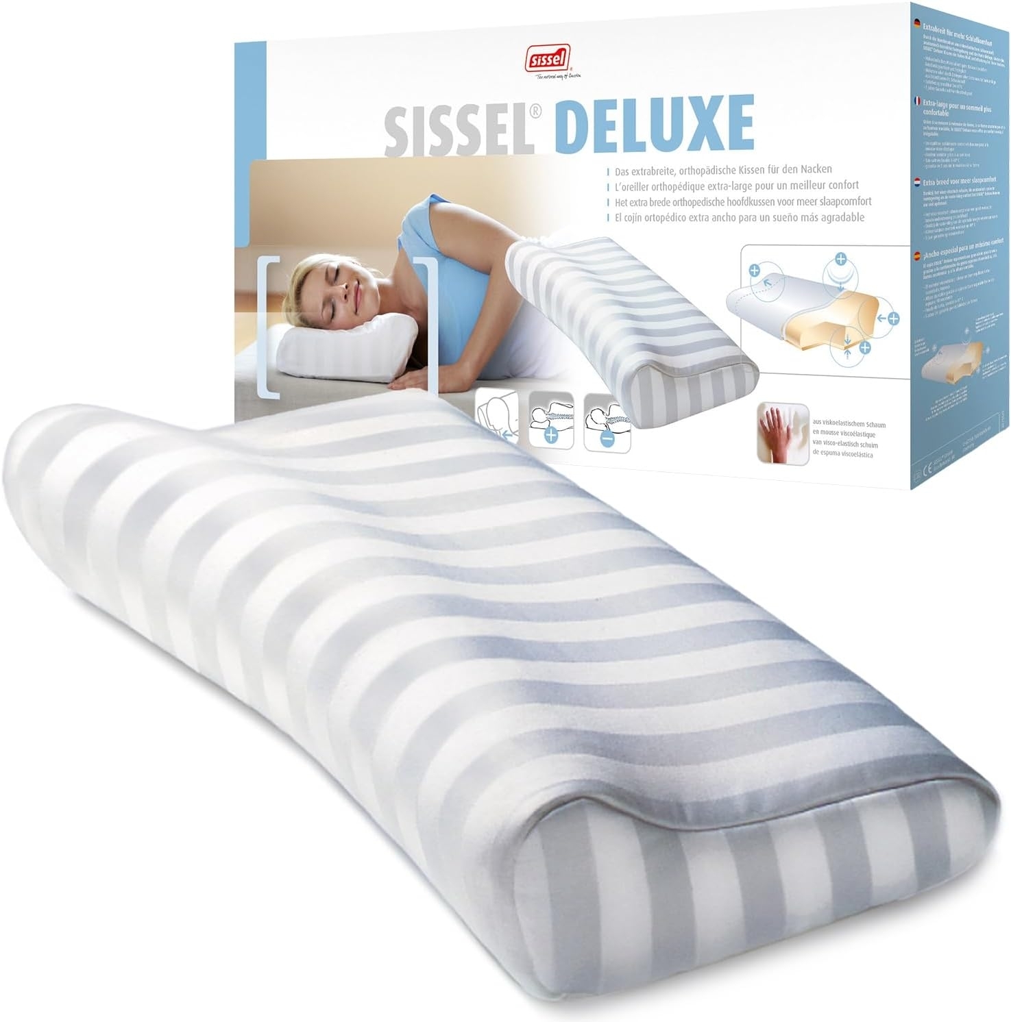 Das Sissel Nackenkissen Deluxe bietet Ihnen optimalen Komfort durch seine Höhenverstellbarkeit und extra breite Form. Die Höhe lässt sich individuell anpassen, indem Sie die Vario-Einlage einlegen oder herausnehmen. Der hochwertige Satinbezug sorgt für ein angenehmes Hautgefühl und ist bei 40 °C waschbar. **Highlights** - Höhenverstellbar für individuellen Komfort - Extra breites Design für besseren Halt - Hochwertiger Satinbezug für ein angenehmes Gefühl - Waschbar bei 40 °C für einfache Pflege - Memory-Schaum-Füllung für optimale Anpassung **Produkteigenschaften** - Farbe: Weiß - Material: Satinbezug und Memory-Schaum-Füllung - Abmessungen: 63 x 33 x (10 - 12) cm (L x B x H) - Materialzusammensetzung: Baumwolle 50%, Polyester 50% **Lieferumfang** - 1x Sissel Nackenkissen Deluxe - Vario-Einlage - Hochwertiger Satinbezug