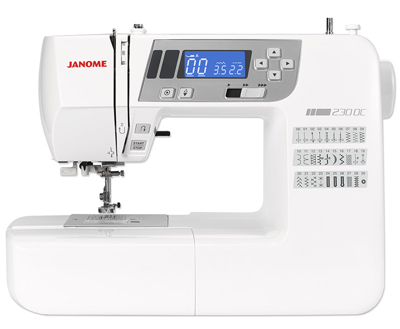 • Die Janome DC 230 ist eine Computer-Nähmaschine in der Farbe weiß.