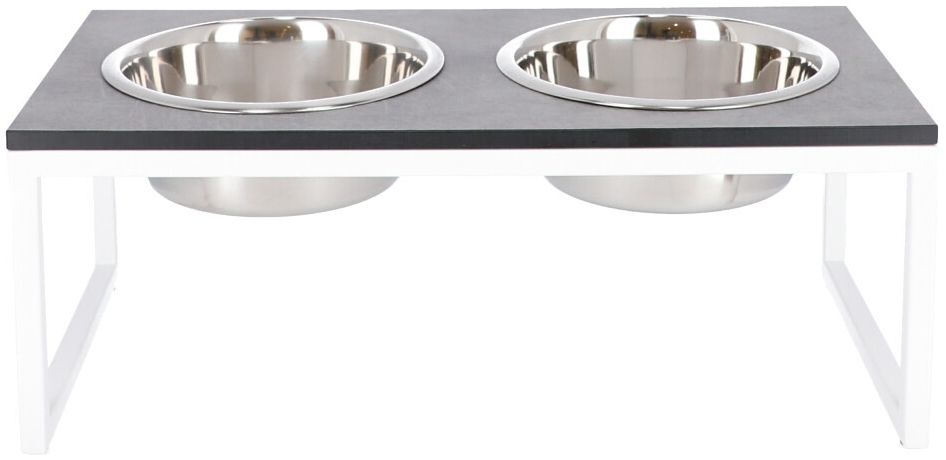 Der Hundenapf "Dimo SHARE 10" von Jan Kurtz, ist ein hochwertiges Futternapfgestell mit zwei Edelstahl-Näpfen und einer 12 mm dicken Platte aus HPL-Schichtstoff. Die beiden Näpfe haben einen Durchmesser von jeweils 20 cm und ein Fassungsvermögen von 1,8 L. Das Moderne, erstklassige Design passt zu jedem Einrichtungsstil und beeindruckt sicher auch ihre Vierbeiner. Das Gestell ist pulverbeschichtet, die einzelnen Rohre haben eine Größe von 15 × 15 mm. Durch die zwei Näpfe sind Sie flexibler, denn Sie können entweder zwei Hunde gleichzeitig füttern oder befüllen den einen Napf mit Futter und den anderen mit Wasser. Dimo ist in insgesamt neun verschiedenen Farbkombinationen erhältlich.