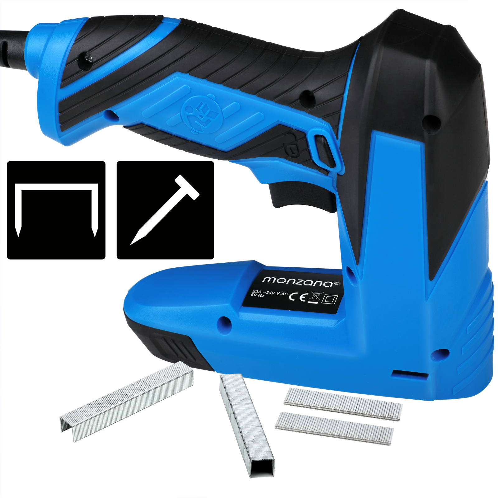 Der Monzana® Kombi Elektrotacker ist ein benutzerfreundliches Gerät mit einstellbarer Schlagstärke, das für verschiedene Bastel- und Handwerksarbeiten geeignet ist. Die Qualität wird als solide beschrieben, jedoch gibt es Berichte über unzureichende Kraft bei bestimmten Anwendungen und Probleme mit der Verfügbarkeit von Ersatzklammern.