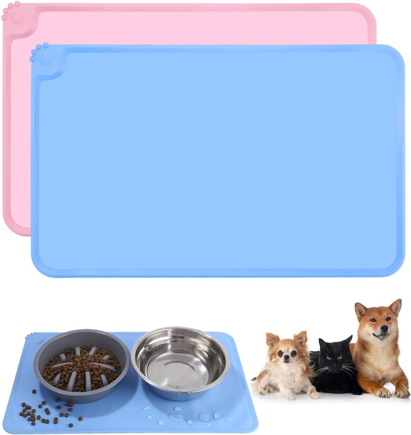 Großes Forma: Napfunterlage Hund Katzen X 2, 48x30 cm, kleinere Pfoten erleichtern das Aufnehmen, geeignet für kleine, mittelgroße bis große Hunde oder Katzen, auch andere Haustiere können verwendet werden. Sicheres Material: FDA-zugelassenes Silikonmaterial, Unsere Futterunterlage für Katzen und Hunde besteht zu 100% aus Silikon, gesund und sicher, kein Verblassen der Farben. Sie ist sehr rutschfest, robust, geruchlos, wasserfest und leicht zu reinigen. Wasser- und schmutzabweisend: Der hohe Innenrand sorgt dafür, dass Wasser und Futter auf der Silikon Unterlage bleiben. Durch die Unterlegmatte wird Dein Boden geschont und bleibt sauber & trocken. Einfach zu säubern: Unsere Silikonmatte lässt sich sehr einfach und blitzschnell reinigen. Eingetrocknete Futterreste unter fließendem Wasser abspülen, kurz einweichen lassen und dann mit einem feuchten Tuch abwischen. Alternativ kann die Silikonunterlage auch in der Spülmaschine gereinigt werden. Breite Anwendbarkeit: Perfekt für Stabilisierungsschüsseln, Wasserbrunnen, Ständer, Futterautomaten, Futtermatten haben erhöhte Ränder, um zu verhindern, dass Haustiere Futter, Wasser und Snacks auf dem Boden verteilen, was eine großartige Lösung ist, um den Boden sauber zu halten.