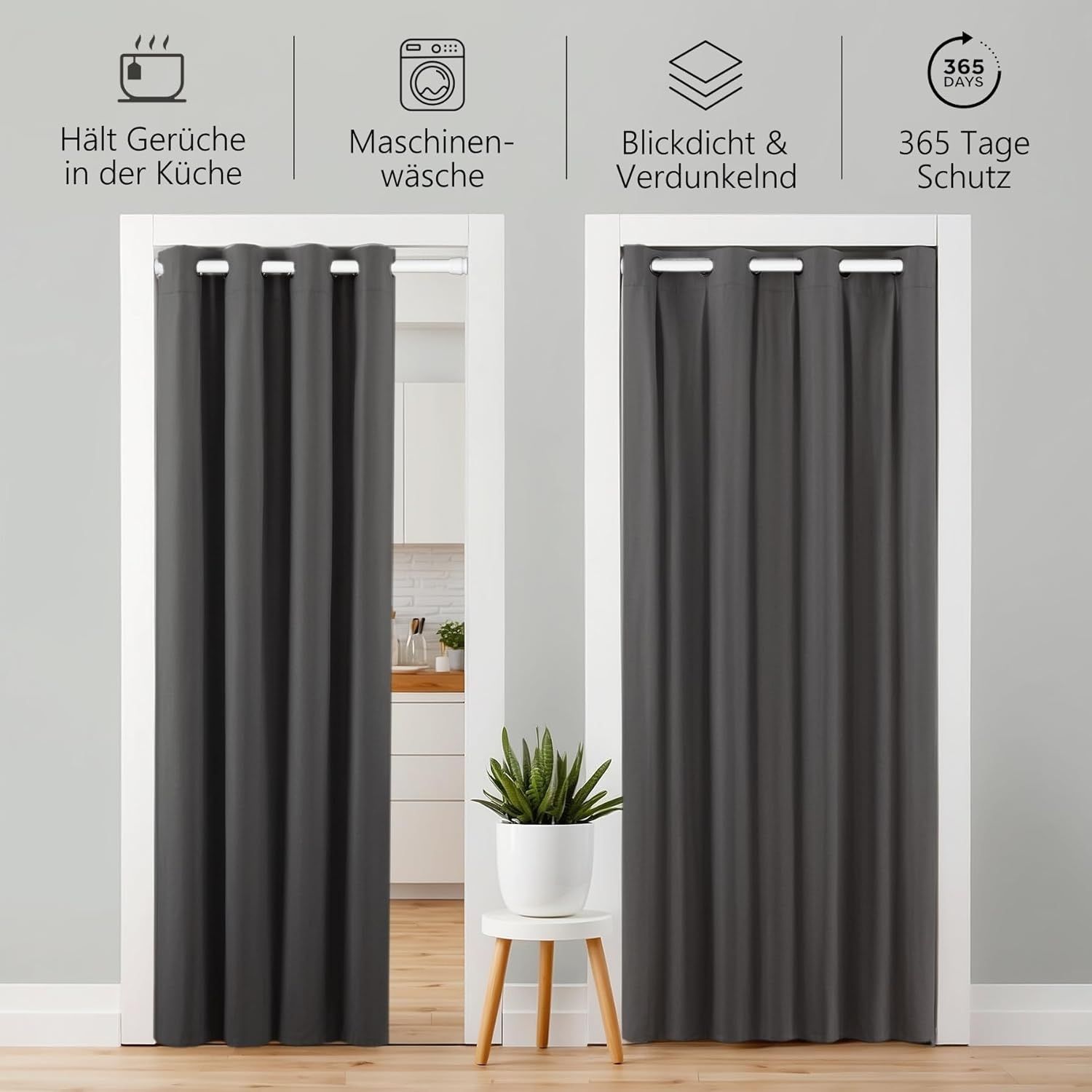 tinycurtains Türvorhang mit Stange weiß 70-120 cm Thermo Vorhang ohne Bohren blickdicht, Ösen, verdunkelnd, Polyester, blickdicht, Anthrazit Nebula, Türgardine mit Klemmstange verdunkelnd