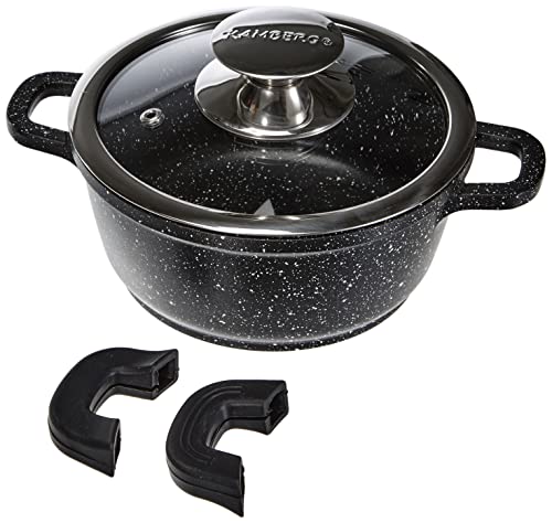Der Kamberg Kochtopf aus Aluminiumguss mit Steinoptik-Beschichtung bietet eine hervorragende Antihaftwirkung und ist leicht zu reinigen. Er eignet sich für alle Herdarten, einschließlich Induktion, und ist backofengeeignet. Die Größe ist ideal für große Mahlzeiten, jedoch werden die Griffe beim Kochen heiß. Der Glasdeckel könnte stabiler sein.