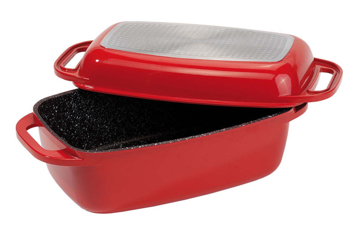 Die innovative Antihaftbeschichtung ermöglicht fettfreies Kochen und der Deckel dient zusätzlich als Auflaufform.