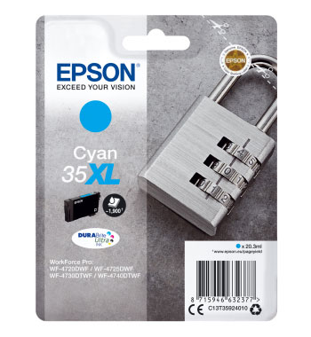Die Epson Original 35XL Tinte Schloss in der Farbe Cyan bietet eine hohe Druckqualität und ist ein Originalprodukt des Herstellers. Die Patronen verursachen keine Fehlermeldungen im Drucker und sind somit einfach zu bedienen.
