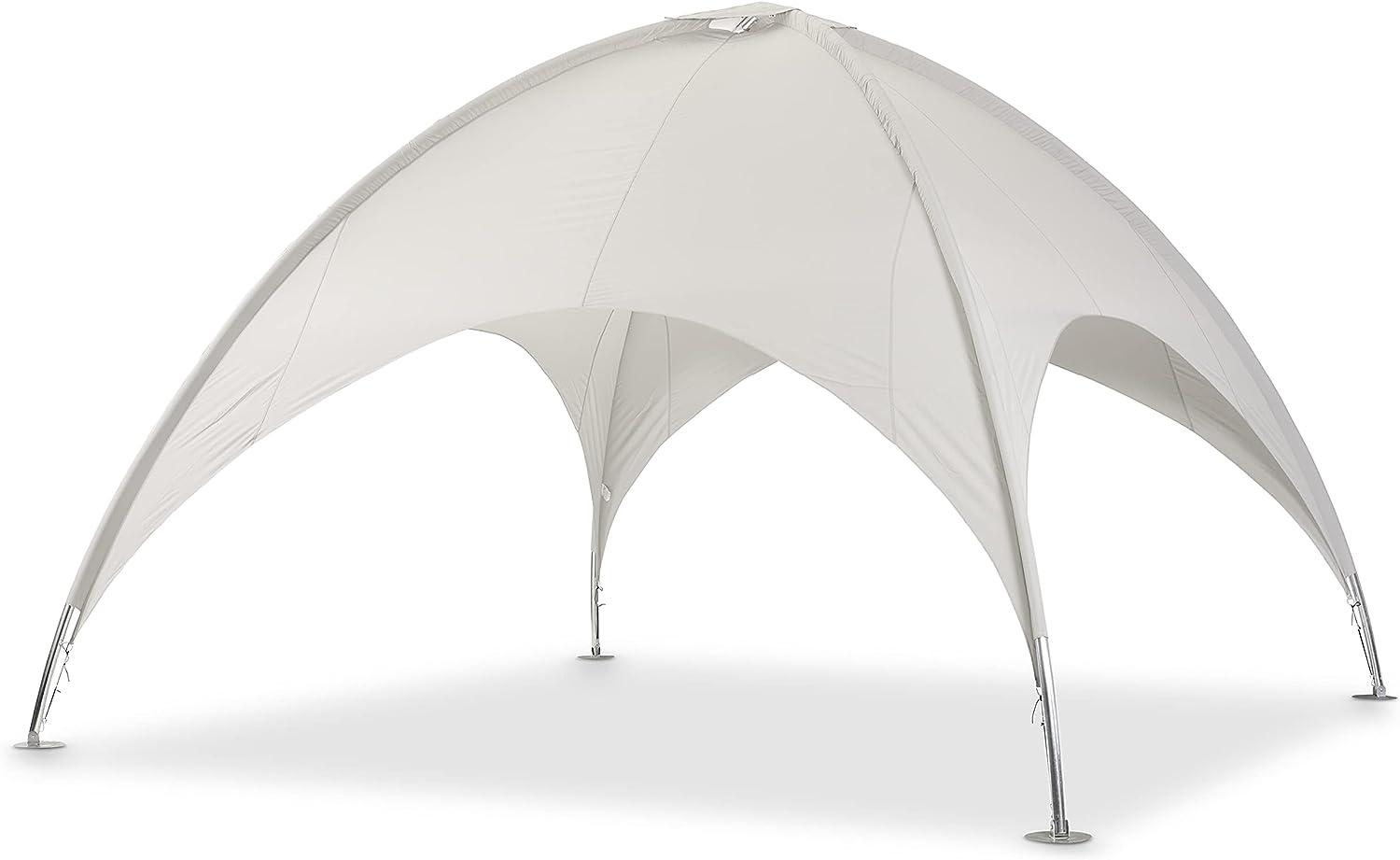 Das Leco Kuppelzelt ist der absolute Blickfang auf Ihrer nächsten Gartenparty! Mit seinem außergewöhnlichen Design und dem vollverzinkten Stahlrohrgestell ist es nicht nur ein zuverlässiger Sonnenschutz, sondern auch äußerst stabil und langlebig. Das robuste Dachtextil aus 100% Polyester ist wasserabweisend beschichtet und schützt Sie und Ihre Gäste vor kurzen Regenschauern. Das Kuppelzelt eignet sich auch als Sonnenschirm- oder Pavillonersatz. Bitte beachten Sie, dass Sie bei starkem Wind, Regen oder Schnee das Dachtextil entfernen sollten. **Highlights** - Außergewöhnliches Design - Vollverzinktes Stahlrohrgestell - Robustes und wasserabweisendes Dachtextil aus 100% Polyester - Einfacher Auf- und Abbau - Ideal als Partyzelt **Produkteigenschaften** - Größe Außenmaß: 5 x 5 x 3,50 m (L x B x H) - Gewicht: ca. 44 kg - Material: Vollverzinktes Stahlrohrgestell, Dachtextil aus 100% Polyester - Witterungsbeständig - Empfohlene Lagerung bei längerem Nichtgebrauch oder mit Schutzhaube abdecken