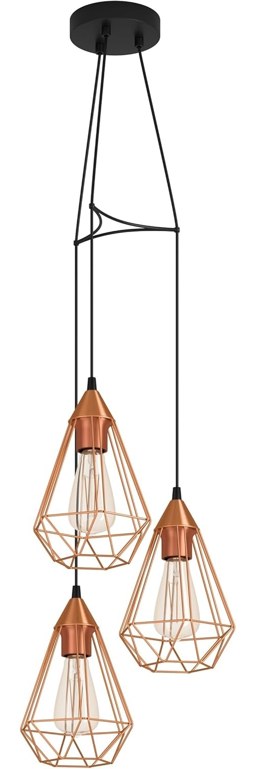 #### Eglo 'Tarbes' Hängeleuchte, Stahl kupferfarben, dimmbar, E27, 3x40W - ideal für Wohnzimmer und Esszimmer - dekorative, diamantförmige Lampenschirme aus Draht - moderner Blickfang in Kupfer - freie Sicht auf die Leuchtmittel - in verschiedenen Ausführungen erhältlich **Höhe**: 110cm **Durchmesser**: 31cm **Gewicht in kg**: 1,4 **Leuchtmittel** **enthalten**: nein **Leuchtmitteltyp**: E27 **max. Watt Leuchtmittel**: 3X40W **dimmbar**: JA **Schutzart**: IP20 **Gehäusematerial:** Stahl **Gehäusefarbe:** schwarz **Glas-/Schirmmaterial**: Stahl **Glas-/Schirmfarbe**: kupferfarben **Zusatzinformation**: Kabelfarbe schwarz