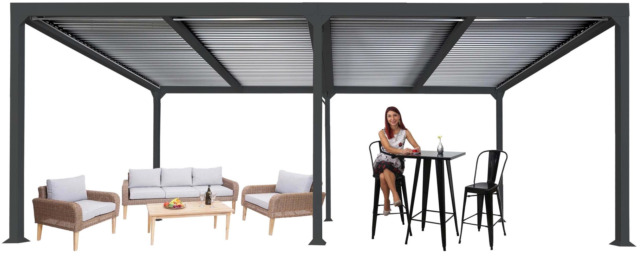 Genießen Sie entspannte Stunden im Freien mit der Mendler 'HWC-L41' Pergola. Diese elegante Pergola in anthrazit bietet ein drehbares Lamellendach, das Ihnen ermöglicht, den Schatten individuell zu regulieren. Mit einer stabilen Konstruktion aus pulverbeschichtetem Aluminium und einer Gesamtgröße von 224 x 590 x 306 cm ist sie sowohl für den Garten als auch als Erweiterung Ihres Hauses ideal. **Highlights** - Drehbares Lamellendach für regulierbaren Schatten - Handkurbel zum manuellen Einstellen der Lamellen (von 0° bis 80°) - Stabiles Aluminium-Gestell mit 8 x 8 cm Pfosten - Integrierter Regenablauf in den Pfosten - Regenfest und robust **Produkteigenschaften** - Maße (HxBxT): 224 x 306 x 590 cm - Durchgangshöhe: 212 cm - Gesamtgewicht: ca. 165 kg - Material: Gestell aus pulverbeschichtetem Aluminium, Lamellen aus Aluminium, Schrauben aus 304 Edelstahl - Materialdicke: 2,00 mm - Füße für stabile Standfestigkeit inklusive **Lieferumfang** - Pergola ohne Seitenwände - Lieferung erfolgt ohne Dekoration - Schrauben für die Verankerung nicht im Lieferumfang enthalten