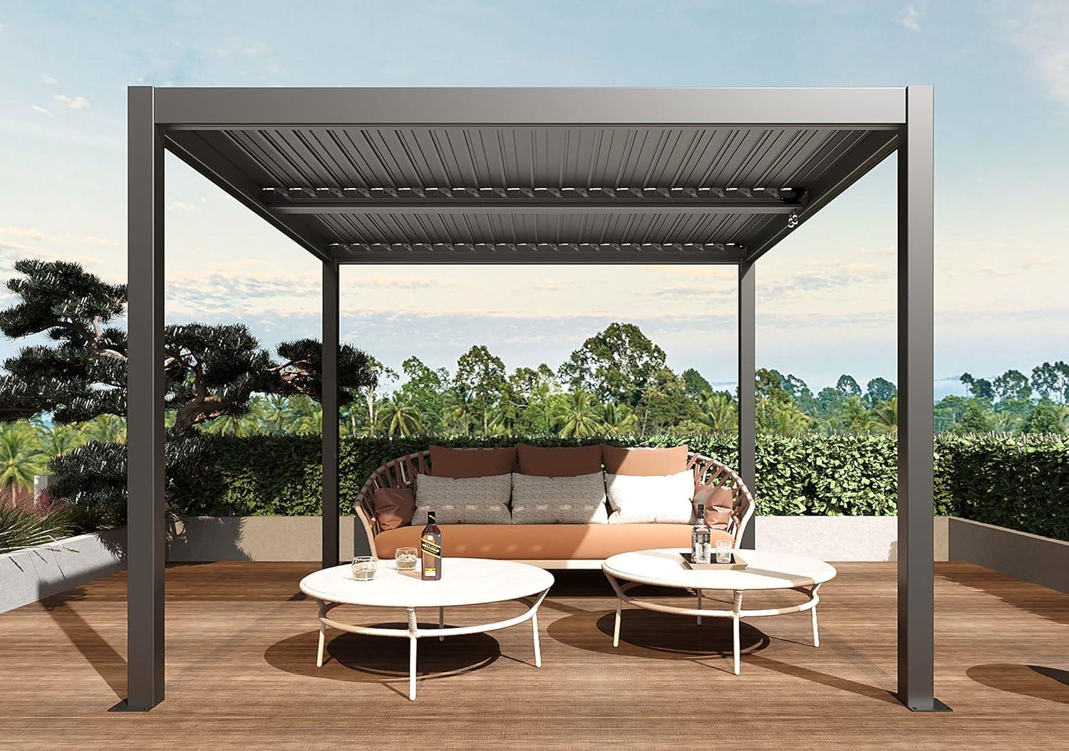 Genießen Sie entspannte Stunden im Freien mit der Mendler 'HWC-L46' Pergola. Diese stilvolle Pergola bietet ein Dach mit drehbaren Lamellen, das sich manuell über eine Kurbel einstellen lässt. Mit einer integrierten wasserdichten Regenrinne und einem stabilen Gestell ist sie sturmfest bis 100 km/h. Die maximale Belastbarkeit des Daches beträgt 40 kg pro m². Ideal als Terrassenüberdachung oder freistehend. **Highlights** - Dach mit drehbaren Lamellen für individuelle Lichtregulierung - Kurbel zum manuellen Einstellen der Lamellen - Integrierte wasserdichte Regenrinne für effektiven Wasserabfluss - Sturmfest bis 100 km/h - Windstärke 10 - Maximale Belastbarkeit Dach 40 kg pro m² **Produkteigenschaften** - Maße (HxBxT): 220 x 300 x 400 cm - Lamellenmaße: 290 x 12 x 2 cm - Pfostenmaße: 10 x 10 cm - Bodenplatte: 16 x 16 cm - Kurbellänge: 113 cm - Durchgangshöhe: 207 cm - Material: Gestell und Dach aus pulverbeschichtetem Aluminium, Kurbel aus Stahl (95%) + Kunststoff (5%), Schrauben aus Stahl - Farbe: anthrazit - Gesamtgewicht: ca. 122 kg **Lieferumfang** - Pergola - Schrauben zur Montage - Lieferung erfolgt ohne Dekoration