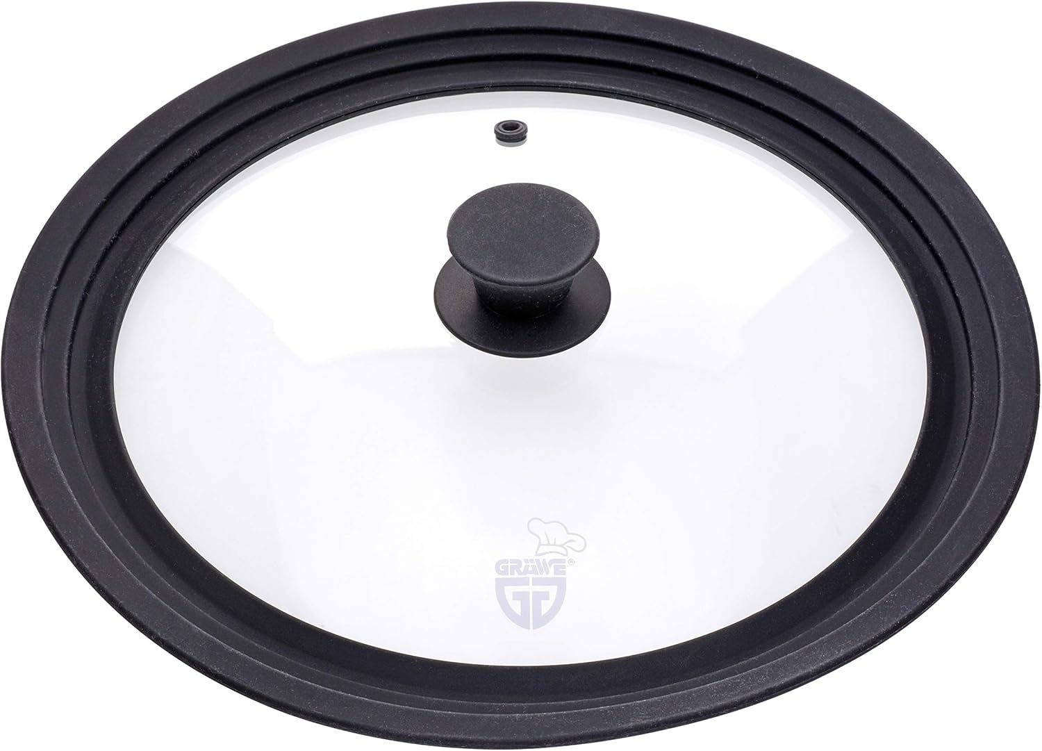 Der GRÄWE Universal-Glasdeckel mit Silikonrand in Schwarz ist ein vielseitiger und stabiler Deckel für Töpfe und Pfannen. Hergestellt aus gehärtetem Glas, passt er auf verschiedene Größen von 28 cm bis 32 cm. Der Deckel verfügt über einen hitzebeständigen Silikongriff und ein Loch für den Dampfaustritt. Er ist spülmaschinengeeignet und hitzebeständig bis ca. 220 °C. **Highlights** - Gehärtetes Glas für hohe Stabilität - Breiter abgestufter Silikonrand für verschiedene Größen - Griff und Loch für Dampfaustritt aus hitzebeständigem Silikon - Spülmaschinengeeignet - Hitzebeständig bis ca. 220 °C **Produkteigenschaften** - Material: Gehärtetes Glas, Silikon - Farbe: Schwarz - Abmessungen: Innendurchmesser Topf/Pfanne: Minimum ca. 27,7 cm, Maximum ca. 32 cm; Gesamtdurchmesser ca. 33 cm - Gewicht: ca. 815 g **Lieferumfang** - 1 Glasdeckel 28 - 32 cm in Schwarz