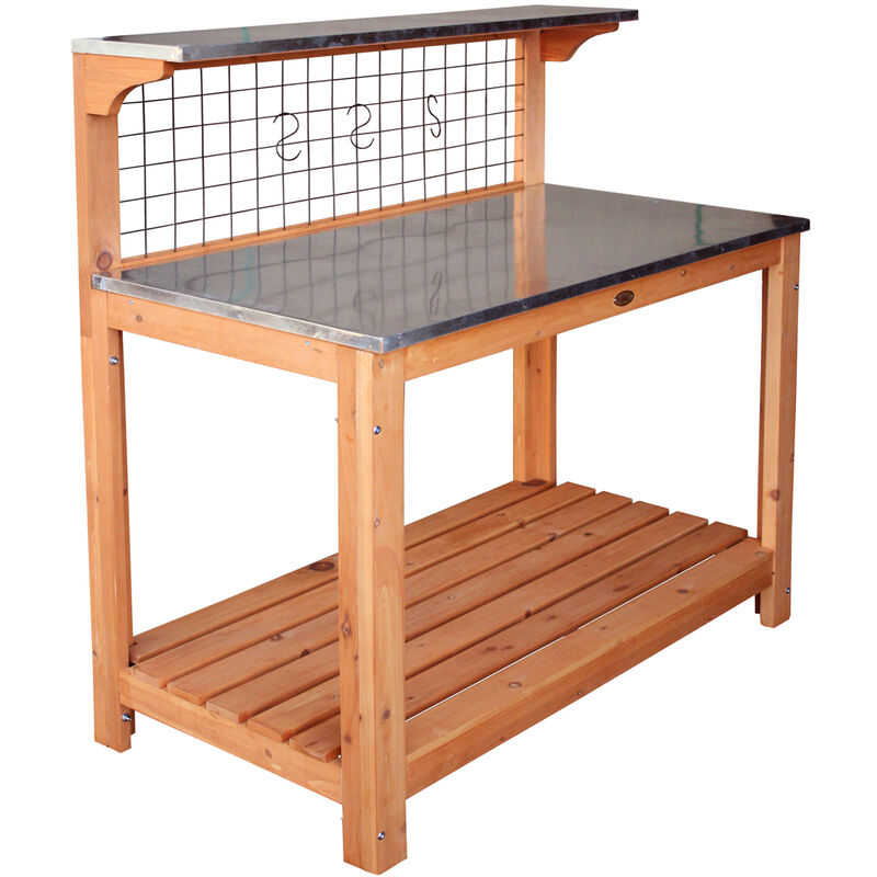 Der Tisch bietet eine stabile und großzügige Arbeitsfläche, die ideal für Gartenarbeiten ist. Die hochwertige Verarbeitung sorgt dafür, dass keine splittrigen Holzstellen vorhanden sind, was den Komfort bei der Nutzung erhöht. Zudem ermöglicht das integrierte Gitter Aufhängemöglichkeiten für Werkzeuge und Zubehör, wodurch alles in Reichweite bleibt und effizienter gearbeitet werden kann.