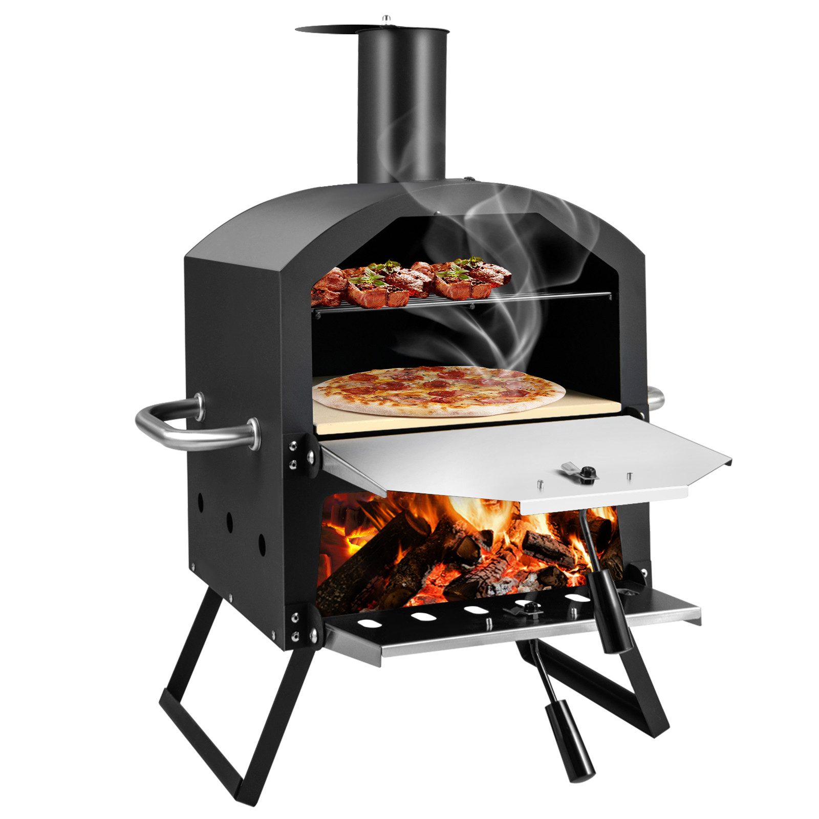COSTWAY Pizzaofen 2-Schicht HolzofenOutdoor, mit Pizzastein & Pizzaschaufel, Metall & Edelstahl, schwarz