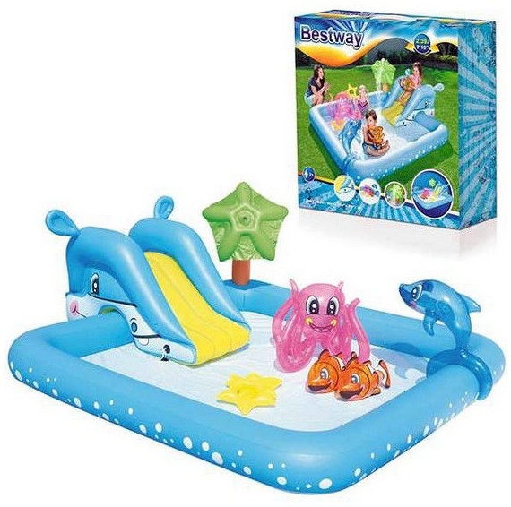 **Bestway® Wasserspielcenter „Aquarium“ 239 x 206 x 86 cm** Meerestiere sorgen für Spielvergnügen im Wasserspielcenter Fantastic Aquarium von Bestway® ! Beim Schwimmen mit Delfin, Clownfisch und Oktopus haben Kinder einen Wahnsinnsspaß. Außerdem können sie Ringe über die Tentakel werfen! Wenn Sie einen Gartenschlauch anschließen, sprüht Wasser aus der Palme, was den Spaß erhöht und die Kinder beim Spielen in der Sonne abkühlt. Auf der abnehmbaren Rutsche können Kinder hinunter in den Pool gleiten. Das Wasserspielcenter besitzt ein einfach zu handhabendes Ablassventil. Damit kann es schnell verstaut werden, wenn es ans Aufhören geht. Um den Sommer in vollen Zügen zu genießen, brauchen Sie und Ihre Kinder das Wasserspielcenter Fantastic Aquarium von Bestway! **Produktdetails** - Altersempfehlung: ab 2 Jahren - Größe aufgeblasen: 239 x 206 x 86 cm - Größe unaufgeblasen: 201 x 201 cm - Wasserkapazität: 308 Liter - Abnehmbare Rutsche mit Seil und Ösen zur Befestigung - Integrierter Wasser-Sprüher zum Anschluss an einen Gartenschlauch - Viele Spielmöglichkeiten - Integriertes Ablassventil - Aus strapazierfähigem 0,27/0,17 mm Vinyl - Inklusive: - Aufblasbarer Rutsche - Oktopus Ringwurfspiel mit 2 Seestern-Ringen - Delfin zur Befestigung am Rand - 2 Clownfischen - Selbstklebendem Reparaturflicken ACHTUNG!LASSEN SIE IHR KIND NIEMALS UNBEAUFSICHTIGT – GEFAHR DURCH ERTRINKEN.