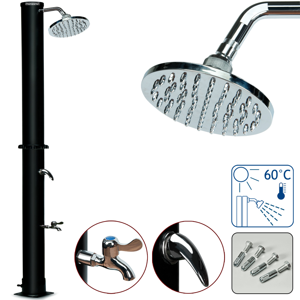 Die monzana® Solardusche Pooldusche bietet eine praktische Möglichkeit, sich im Garten oder am Pool zu duschen und dabei warmes Wasser zu genießen. Dank der Warmwasserfunktion bei sonnigem Wetter können Sie auch ohne Stromanschluss ein angenehmes Duscherlebnis erleben. Die solide Verarbeitung und das ansprechende Design sorgen zudem für eine optisch ansprechende Ergänzung in Ihrem Outdoor-Bereich. Mit einem Vorrat von 20 Litern Warmwasser ist die Dusche ausreichend dimensioniert, um den Bedarf von bis zu zwei Personen abzudecken.