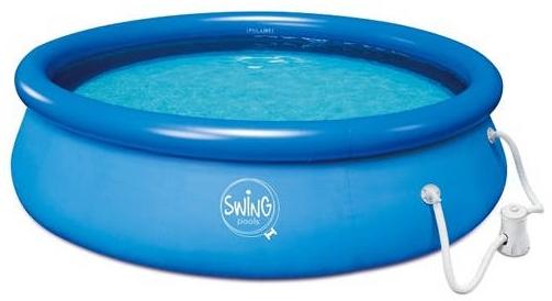 Der SWING Pool 3,66 m x 0,91 m mit Kartuschen-Filteranlage ist der perfekte Aufstellpool für eine schnelle Abkühlung im Sommer. Der kinderleichte Aufbau dauert nur 10 Minuten. Die robusten, UV-beständigen Wände sorgen für eine langlebige Struktur. Ausgestattet mit einem Entleerungsventil und zwei Anschlüssen für die Filterpumpe, bietet dieser Pool alles, was Sie für unbeschwerte Sommertage benötigen. Geeignet für Kinder ab 6 Jahren. **Highlights** - Schneller und unkomplizierter Aufbau in nur 10 Minuten - Robuste, UV-beständige Wände für eine langlebige Struktur - Inklusive Kartuschen-Filterpumpe für sauberes Wasser - Entleerungsventil und zwei Anschlüsse für die Filterpumpe - Geeignet für Kinder ab 6 Jahren **Produkteigenschaften** - Abmessungen: 3,66 x 0,91 m - Material: PVC mit reißfestem Polyester-Gewebe - UV-Schutz beständige Schicht - Durchmesser der Anschlüsse für die Filterpumpe: 32 mm **Lieferumfang** - SWING Pool 3,66 x 0,91 m mit Kartuschen-Filteranlage - Kartuschen-Filterpumpe (12 V 2271 L)