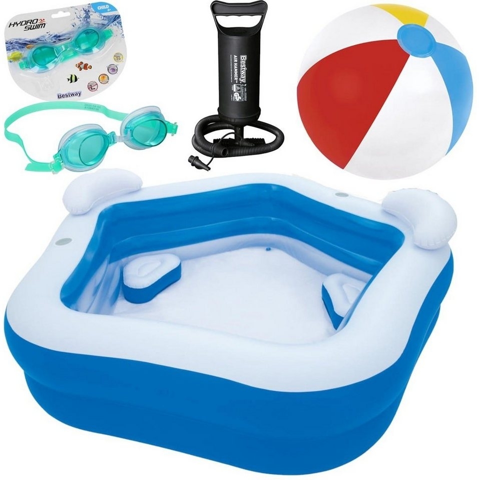 Der 4IN1 Familien-Gartenpool von Bestway® bietet ultimativen Spaß im Freien für die ganze Familie. Mit einer Größe von 213 x 207 x 69 cm und extra breiten Seitenwänden ist er ideal zum Planschen und Spielen. Das Set enthält eine elektrische Batteriepumpe, eine Kinder-Tauchbrille und einen großen Strandball. Getränkehalter, aufblasbare Kissen und eine Kopfstütze sorgen für zusätzlichen Komfort. Der Abbau erfolgt einfach über das Auslassventil. **Highlights** - 4IN1 Familien-Gartenpool für ultimativen Spaß im Freien - Mit elektrischer Batteriepumpe, Kinder-Tauchbrille und großem Strandball - Extra breite Seitenwand für junge Familien zum Planschen und Spielen - Getränkehalter, aufblasbare Kissen und Kopfstütze für Entspannung - Einfacher Abbau dank Auslassventil **Produkteigenschaften** - Größe: 213 x 207 x 69 cm - Pack Maß: 40 x 40 x 15 cm - Geeignet für: Ab 6 Jahren - Farbe: Blau, Weiß - Material: Vinyl **Lieferumfang** - Luftpumpe - Ball - Schwimmbrille