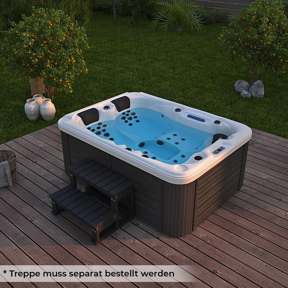 Unser HOME DELUXE Outdoor-Whirlpool 'Beach Pure' bietet Ihnen ein luxuriöses Wellness-Erlebnis in Ihrem Garten. Mit den kompakten Maßen von 210 x 155 x 83 cm und 51 individuell einstellbaren Massagedüsen sorgt er für optimale Entspannung. Die hochwertige Verarbeitung aus WPC und PMMA garantiert Langlebigkeit und Pflegeleichtigkeit. Genießen Sie die integrierte Heizung und Lichttherapie, während Sie sich in der komfortablen Wanne mit zwei Kopfstützen entspannen. **Highlights** - 51 Massagedüsen für ein individuelles Massageerlebnis - 24 Lichtquellen für entspannende Lichttherapie - Hochwertige WPC-Verkleidung für Langlebigkeit und Pflegeleichtigkeit - Einfache Steuerung aller Funktionen über das Bedienelement - Inkl. Insektenschutz für hygienischen Gebrauch **Produkteigenschaften** - Maße (L x B x H): 210 x 155 x 83 cm - Material Verkleidung: WPC (naturfaserverstärkter Kunststoff) - Acryl: PMMA (Polymethylmethacrylat) - Farbe Wanne: Weiß - Farbe Bekleidung: Schwarz - Energieeffizienzklasse: B - Gesamtleistung ohne Filterleistung: 5300 Watt (25,3 A) - Spannung: 220-240 V 50/60 Hz - Heizleistung: 3000 Watt - Umwälzfunktion: 450 Watt - Whirlpoolfunktion: 2200 Watt - Lautstärke: 75 dB - Füllhöhe: ca. 64 cm (bis Einlauf Wasserfall) - Füllvolumen: 900 l - Gewicht: 270 kg **Lieferumfang** - Whirlpool BEACH PURE (ohne Thermoabdeckung und Treppe) - 2 x Kopfstütze - Filterset - Paketmaße (L x B x H): 215 x 163 x 107 cm