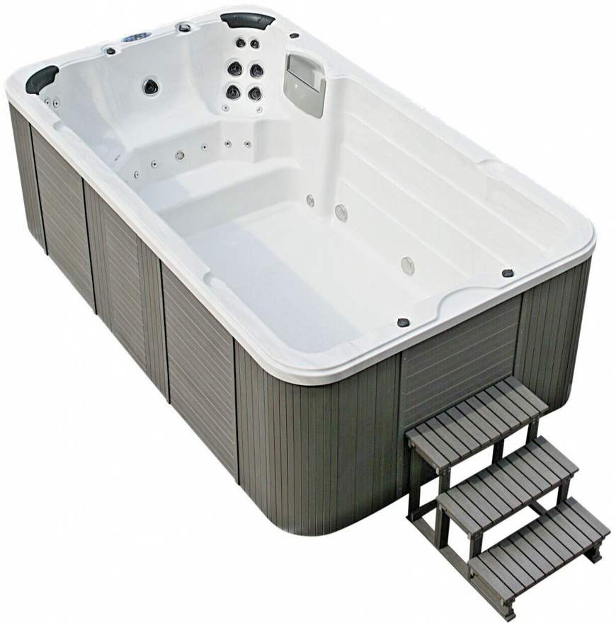 XXXL Luxus-LED Swim Spa, 400 x 230 cm, ist ein hochwertiger Whirlpool mit Gegenstromanlage, ideal für bis zu 8 Personen. Ausgestattet mit modernster Steuerelektronik, Heizung, LED-Farblicht und umfassender Wasseraufbereitung, bietet dieser Spa ein unvergleichliches Schwimmerlebnis. Genießen Sie die therapeutische Wirkung von 21 Hydromassagetherapie-Düsen und 2 Schwimmdüsen. Die vollisolierte Bauweise sorgt für Energieeffizienz und Komfort. **Highlights** - 21 Hydromassagetherapie-Düsen für gezielte Muskelentspannung - Gegenstromanlage mit 2 extragroßen River Jets für optimales Schwimmen - UV Wasseraufbereitung und Ozondesinfektion für kristallklares Wasser - Winterfeste Isolierung für maximale Energieeffizienz - Hochwertiges Acryl von Lucit (USA) mit antibakterieller Oberfläche **Produkteigenschaften** - Maße: 4.000 mm x 2.300 mm x 1.310 mm (Länge x Breite x Höhe) - Wasserkapazität: 4.250 Liter - Gewicht: 1.096 kg - Elektrischer Anschluss: 220 oder 380 Volt - 3 Pumpen (2 Hydropumpen [je 3.000 Watt] und eine Umwälzpumpe [350 Watt]) - Heizung mit Temperaturauswahl (3.000 Watt) - 3 Sitzflächen zur optimalen Entspannung - 10 zusätzliche Luftdüsen für tiefe Entspannung - Doppelfilter-System mit einem Wasserdurchsatz von 10 m² **Lieferumfang** - Komplett anschlussfertig - Außenbeleuchtung inkl. Schürze - Vorinstalliertes System auf Trägergestell - Lieferung mit Plannen-Lkw (Entladung mit Kran erforderlich)