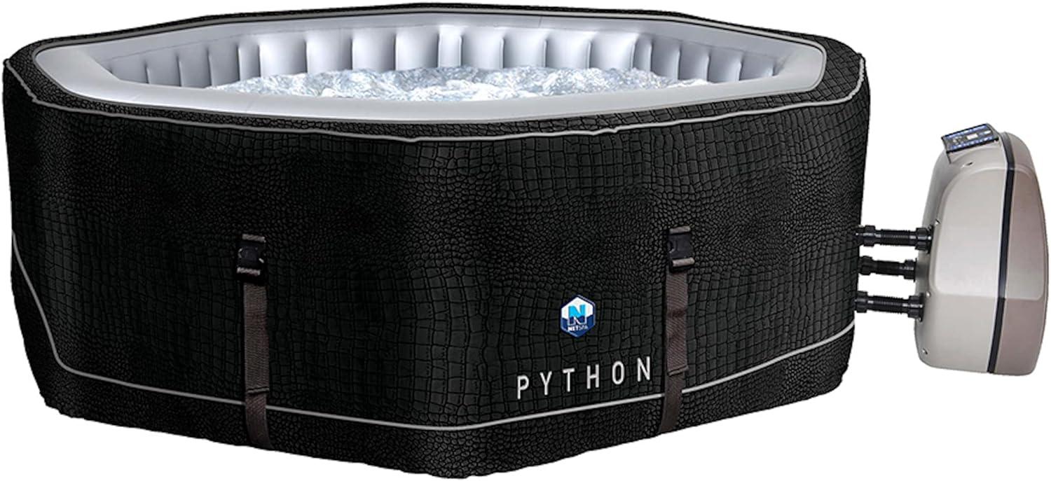 Der NetSpa Python ist ein stilvoller aufblasbarer Whirlpool für 5-6 Personen mit einem achteckigen Design. Mit Außenmaßen von 185 x 185 x 70 cm und einem Innenraum von 145 x 145 cm bietet er ausreichend Platz für Entspannung. Ausgestattet mit 130 Luftdüsen und einer doppelten Außenverkleidung sorgt er für Stabilität und ein angenehmes Massageerlebnis. Die mattschwarze Oberfläche mit Kroko-Effekt verleiht ihm eine edle Optik. **Highlights** - Achteckiges Design für bis zu 6 Personen: Großzügiger Innenraum - Intelligenter Motorblock: Einfache Steuerung aller Funktionen - 130 Luftdüsen: Angenehme Massage - Doppelte Außenverkleidung: Stabilität und Langlebigkeit - Mattschwarze Oberfläche mit Kroko-Effekt: Stilvolles Design **Produkteigenschaften** - Innenmaße: L 145 cm x B 145 cm x H 70 cm - Außenmaße: L 185 cm x B 185 cm x H 70 cm - Fassungsvermögen: ca. 850 L - Leergewicht: 30 kg - Liner außen: Geflochtenes PVC 0,8 mm - Liner innen: Geperltes PVC 0,6 mm - Hülle Außenverkleidung: Kunstleder mit Kroko-Effekt - Isotherme Abdeckung: Erwärmt das Wasser und verhindert Wärmeverlust - Schutz am Boden: Teppich aus synthetischem Gewebe - Verschlüsse: Sicherer Abschluss mit Spezialverschlüssen - Bedienfeld: Integriertes digitales Bedienfeld - Stromversorgung: 240 V ~ 50 Hz **Lieferumfang** - 1 x Net Spa Python aufblasbarer Whirlpool für 5-6 Personen - 1 x antibakterieller Filter - 1 x Abdeckung - 1 x Abflussschlauch - 2 x Verschlüsse - 1 x Filtervorrichtung