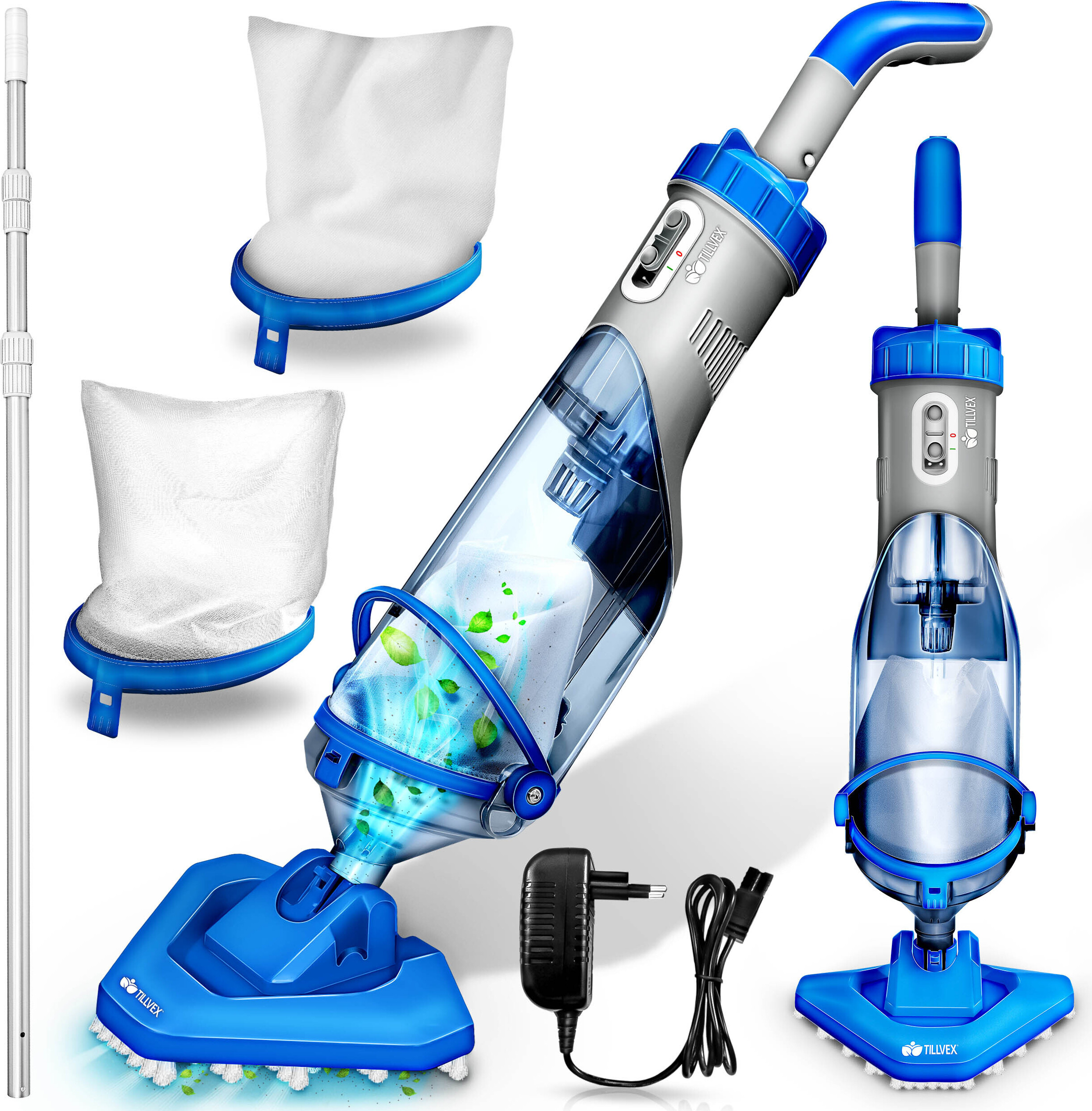 tillvex Poolsauger Blau/Grau mit Akku & Teleskopstange + Ersatzfilter bis zu 15 m³ | Elektrischer Pool Bodensauger mit Filter & 60 min Laufzeit | Kabelloser Handsauger Reinigungsset