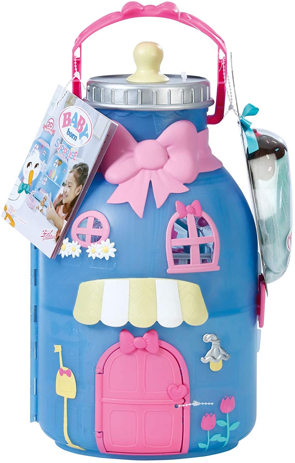 Ein verspieltes Nest vom Storch. Meister Adebar hat eine blaue Babyflasche geliefert, die sich als putziges Haus entpuppt. Und einen ganz speziellen Bewohner hat es auch noch. Wird der Trinkbehälter mit Tragegriff aufgeklappt, öffnet sich eine bezaubernde Wohnlandschaft auf zwei Etagen. Im Erdgeschoss befindet sich das Spielzimmer mit Spielbogen und Teddybär. Gegenüber ist der Wickeltisch inklusive Puderdose und Bürste platziert. Bevor es im Obergeschoss ins Bettchen mit Mobile geht, wird nochmal ausgiebig gebadet. In der Badewanne mit Wasserfunktion inklusive Badeschaumflasche fühlt sich das Baby aus der Flasche so richtig wohl. Das Überraschungs-Babys trinkt gerne Wasser aus dem Fläschchen und macht in die Windel, die sich dann zu einem tollen Muster verfärbt. Die Haare verfärben sich ebenfalls, wenn sie in Berührung mit Wasser kommen. Wenn alle seine Eigenschaften entdeckt wurden, kann das Geburtszertifikat aufgefüllt werden. Inklusive Übersicht über alle BABY born Surprise Babys und Spielspaß. BABY born Surprise Zubehör Zum Spielen und Sammeln Mit Trink- und Pipi-Funktion inkl. magischer Windel Das abwechslungsreiche (Rollen-)Spiel mit BABY born Surprise fördert die Fantasie und unterstützt nachweislich die Entwicklung sozialer Fähigkeiten und Werte wie Verantwortung, Kommunikation und Einfühlungsvermögen BABY born Surprise Baby Bottle House inklusive Überraschungs-Baby und vielen Accessoires.
