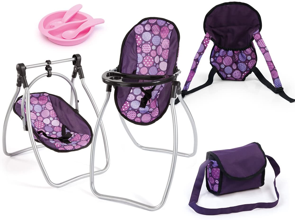 | Name | Bayer Design 63694AB, Puppenzubehör, Puppenhochstuhl, Puppenwiege, Babytrage für Puppen, inkl. Schultertasche und Plastikaccessoires, Pflaume |