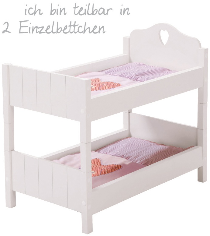 Das Puppenetagenbett bietet die Möglichkeit, zwei Puppen gleichzeitig schlafen zu lassen und fördert so das kreative Spiel von Kindern. Es ermöglicht zudem das gemeinsame Spielen mit Freunden oder Geschwistern, da beide Betten nebeneinander gestellt werden können.