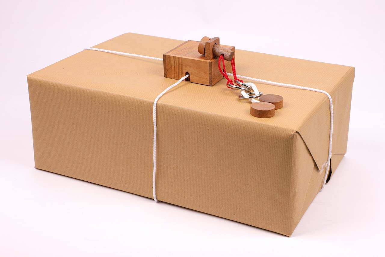 KEEPR - Der Geschenkesafe - Kreatives Geduldsspiel als Geschenkverpackung für Erwachsene und Kinder von Rombol jetzt online bei german-toys kaufen. Macht das Auspacken noch viel spannender! Das Geschenk wird nur mit Seilen eingeschnürt, so sieht der Beschenkte sein Geschenk. Doch so schnelle kann er es nicht in voller Pracht bewundern, denn zuerst muss das Problem eines Schnurrpuzzles gelöst werden. Es ist nicht ganz so schwer, dauert aber dennoch länger als einen gewöhnlichen Knoten zu lösen. Wenn über alle Möglichkeiten eines Öffnungsmechanismus nachgedacht und richtig ausgeführt worden sind - führen die Bemühungen des Beschenkten zum Erfolg! Der Geschenkesafe ist immer wieder einsetzbar und lässt auch super verschenken. Einsetzbar ist der Geschenkesafer von einer Größer einer Tafel Schokolade bis zu einem Fernseher. Die Schnurre sind je 2 lang, können zum Notfall auch ausgetauscht.