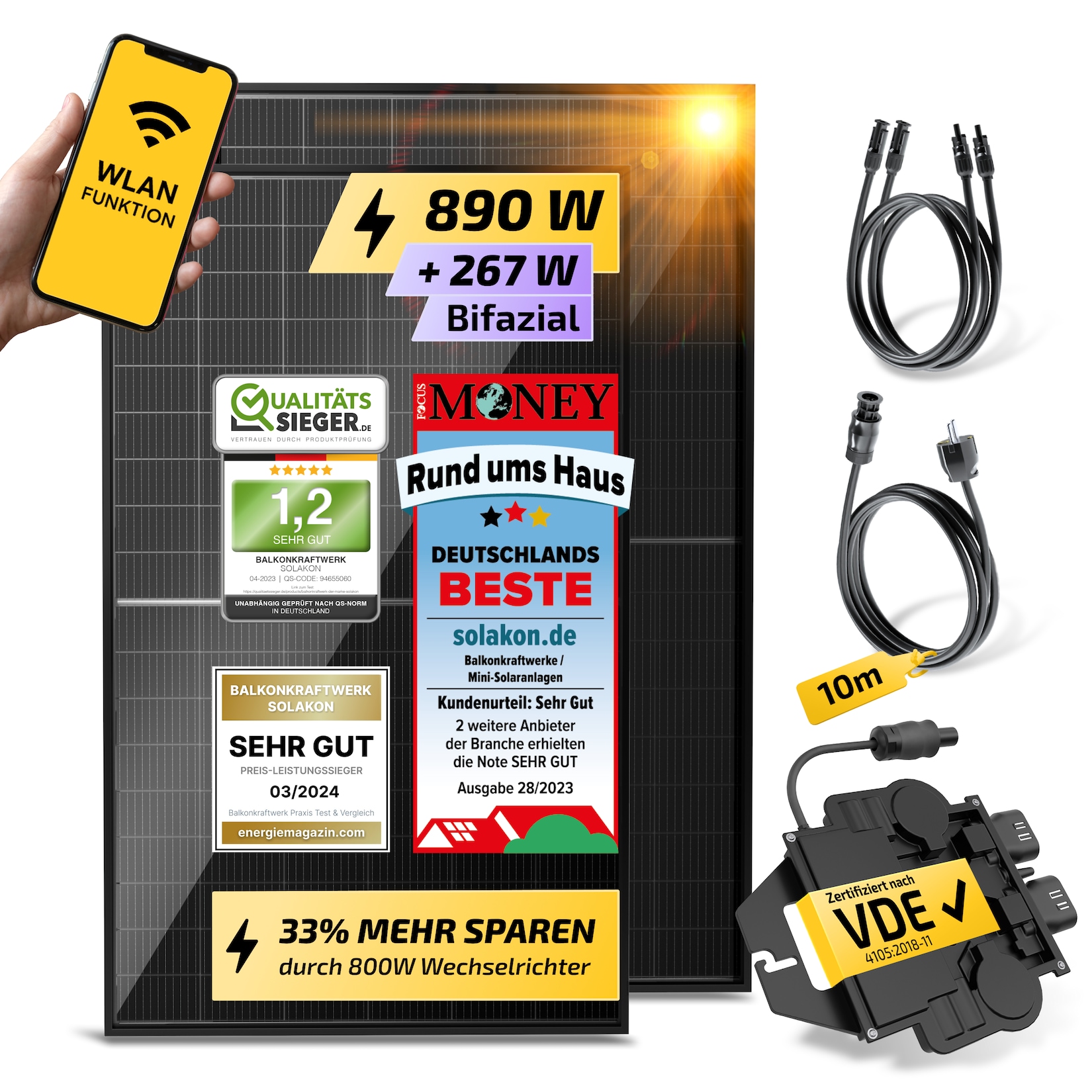 | Leistung | - | 1196 W (Bifazial Max) / 800 W (Wechselrichter) / 920 W (PMax) pro Panel | 1760W | - | - | - | - | 2080W | 1196 W / 800 W | 2300 W AC-Ausgang | - | 1800W | 850W Gesamtleistung | - | - | - | 1196 W / 800 W | - | 1300 W (Maximalleistung), 800 W (Einspeiseleistung) | 800 W | 800 W |