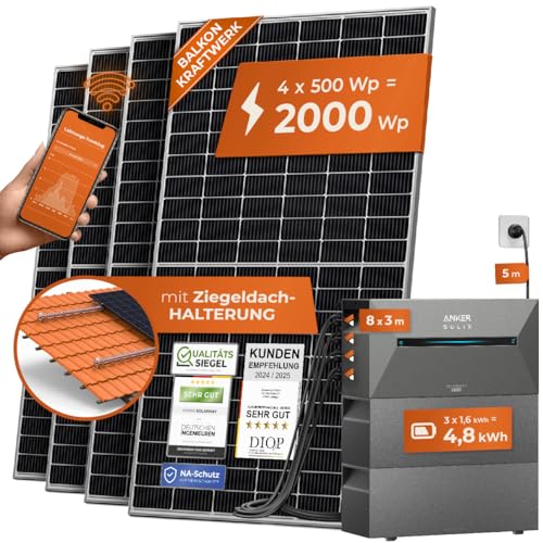 Solarway Balkonkraftwerk Komplett Steckdose2000 Watt + 4,8 kWh, JaSolar-Module, Deye Wechselrichter mit APP & WiFi, Ziegeldach Halterung