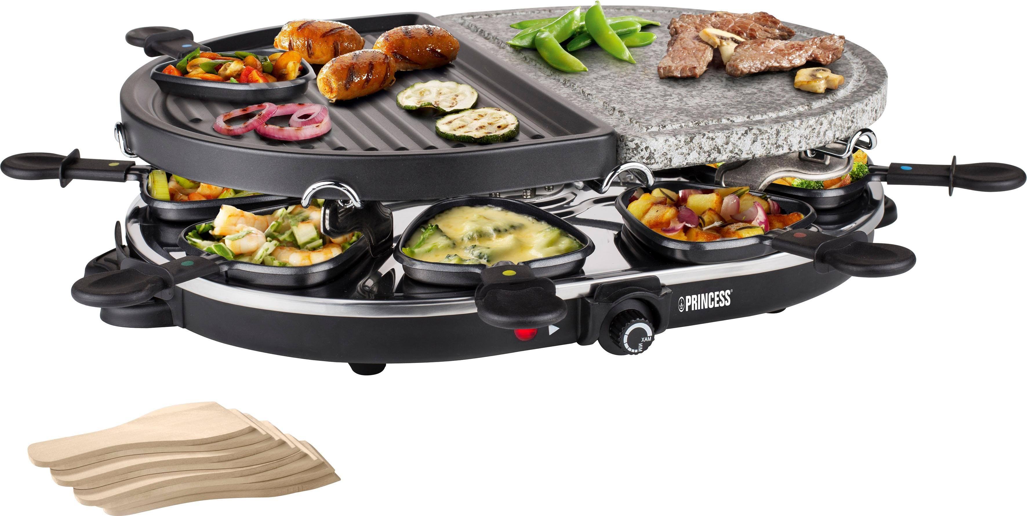 Der Princess Raclette Grill bietet die Möglichkeit, mit bis zu 8 Personen gleichzeitig köstliche Mahlzeiten zuzubereiten. Dank der Kombination aus einer Stein- und antihaftbeschichteten Grillplatte können sowohl Fleisch und Gemüse gegrillt als auch leckere Raclette-Käsespezialitäten geschmolzen werden. Die ovale Form des Grills ermöglicht einen bequemen Zugang zu den Pfännchen, was das gemeinsame Essen noch angenehmer macht.