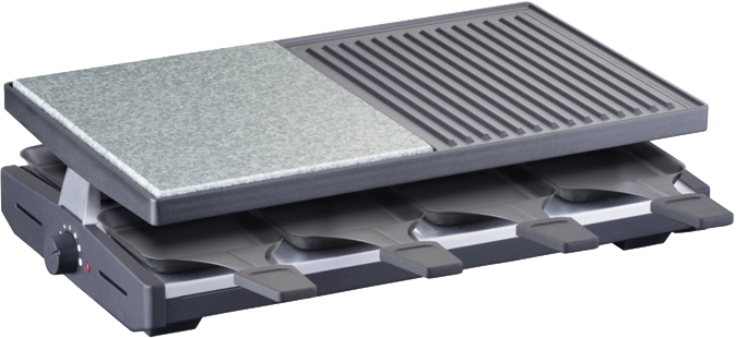 Auch dieses Raclette RC 58 besteht aus einer antihaftbeschichteten Grill- und einer Steinplatte. Sobald sich die Steinplatte richtig erhitzt hat, ist die Wärmeverteilung relativ gleichmäßig. Auch die Pfännchen werden gleichmäßig gebräunt und eignen sich nach vier Minuten schon zum Verzehr. ...
