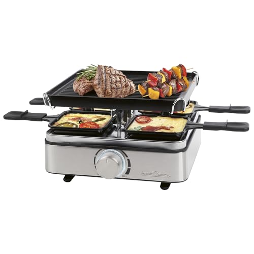 Der ProfiCook® Raclette PC RG 1301 ist ein leistungsstarker Raclette-Grill, der sich gut für größere Gruppen eignet. Er bietet eine hohe Temperatur und vielseitige Kochmöglichkeiten mit einer Grillplatte und einem heißen Stein. Die Verarbeitung ist gut, jedoch gibt es Berichte über Probleme mit der Antihaftbeschichtung und die Größe der Platten könnte für sehr große Gruppen unzureichend sein.