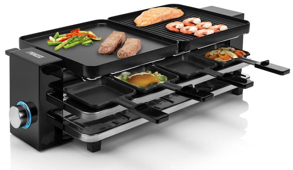 Kombiniert Grill- und Raclette-Funktionalität mit zwei drehbaren Platten für vielseitige Zubereitung und platzsparende Ablage.