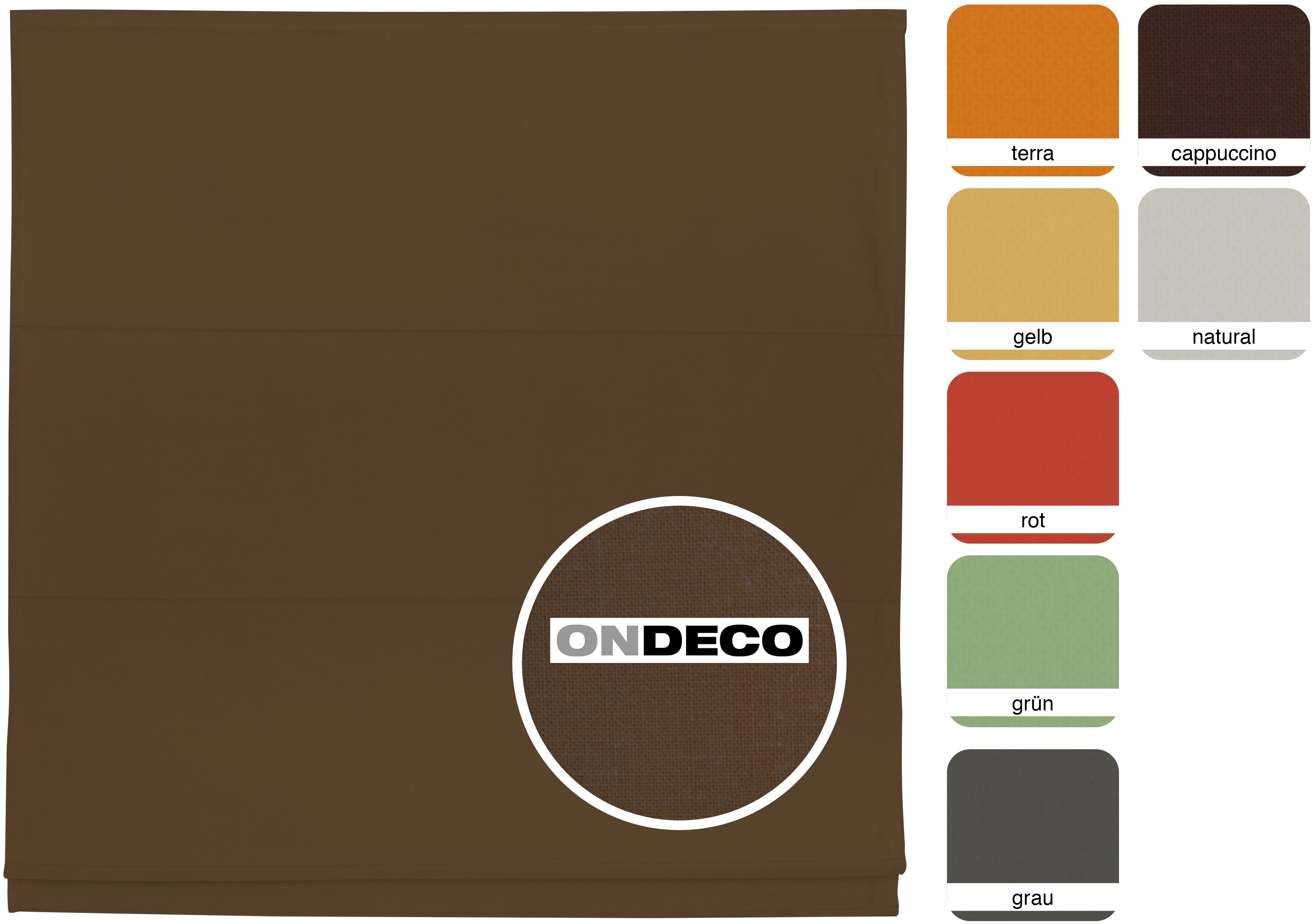Das ONDECO Raffrollo ist die ideale Fensterdekoration für Sicht- und Sonnenschutz. Mit den Maßen 100 x 175 cm in der Farbe Mocca eignet es sich sowohl für die Wand- als auch Deckenmontage. Das blickdichte und lichtdurchlässige Material sorgt für eine angenehme Atmosphäre im Raum. Die einfache Installation ohne Gardinenstange macht es zu einer modernen Zierde für Ihr Zuhause. **Highlights** - Bietet Sicht- und Sonnenschutz - Angenehme Thermofunktion - Einfache Wand- oder Deckenmontage - Attraktive Farbauswahl in Mocca, Cappuccino und Terra - Verschiedene Größen verfügbar **Produkteigenschaften** - Maße: 100 x 175 cm - Farbe: Mocca - Material: Blickdicht und lichtdurchlässig - Einfache Installation ohne Gardinenstange
