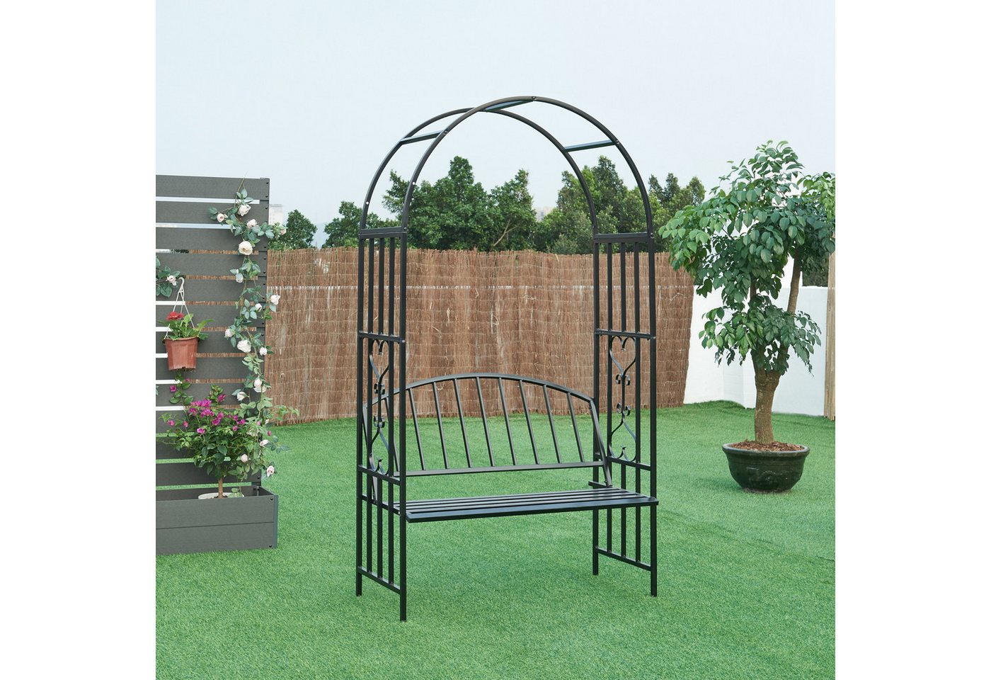 • Entdecken Sie den eleganten Rosenbogen mit integrierter Sitzbank, der als stilvolles Element für Ihren Garten dient