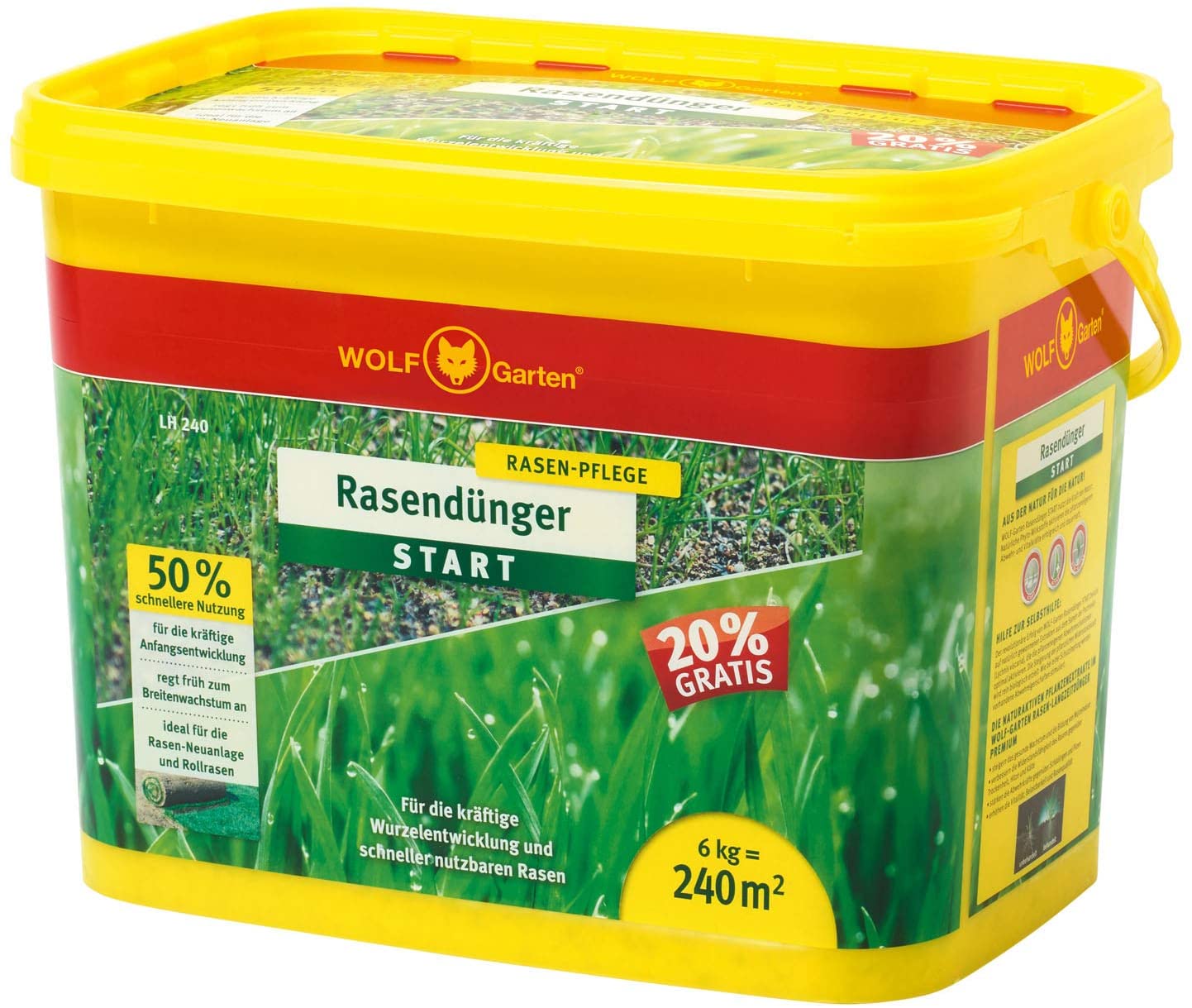 Der WOLF-Garten LH 240 Rasen-Starter-Dünger 6kg für 240 m² NPK 18-20-10 Streudünger ist ein effektiver Dünger für neu angelegte oder nachgesäte Rasenflächen. Der hohe Phosphorgehalt fördert das Wurzelwachstum und die Grasnarbenbildung, was Unkrautwachstum verhindert. Der Dünger ist feinkörnig und lässt sich gut mit einem Streuwagen verteilen. Die Aufwandmenge von 25g/m2 sollte nicht überschritten werden, um Verbrennungen des Rasens zu vermeiden.