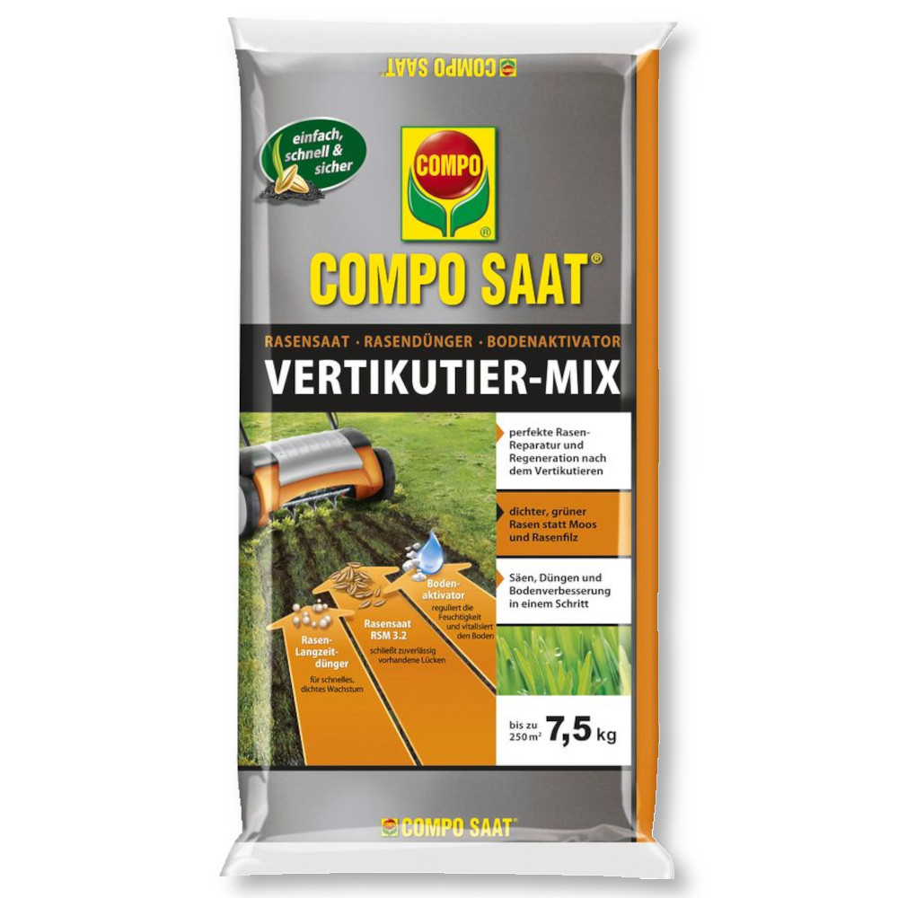 Der COMPO SAAT Vertikutier-Mix ist eine Mischung aus Rasensamen, Dünger und Bodenaktivator, die den Rasen revitalisiert und das Wachstum fördert. Die Anwendung ist einfach und die Ergebnisse sind sichtbar und positiv.