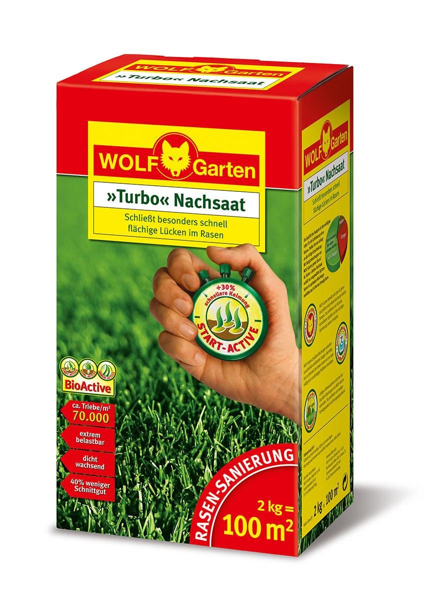 Die WOLF-Garten Turbo-Nachsaat für 100 m² Rasensanierung bietet eine schnelle und lückenlose Lösung zur Erneuerung des eigenen Rasens. Die Anwendung ist einfach und das Ergebnis beeindruckend, denn der neu gewachsene Rasen zeigt sich von hoher Qualität und Dichte. Besonders bei der Schließung von Löchern im Gras erweist sich die Nachsaat als äußerst effektiv.
