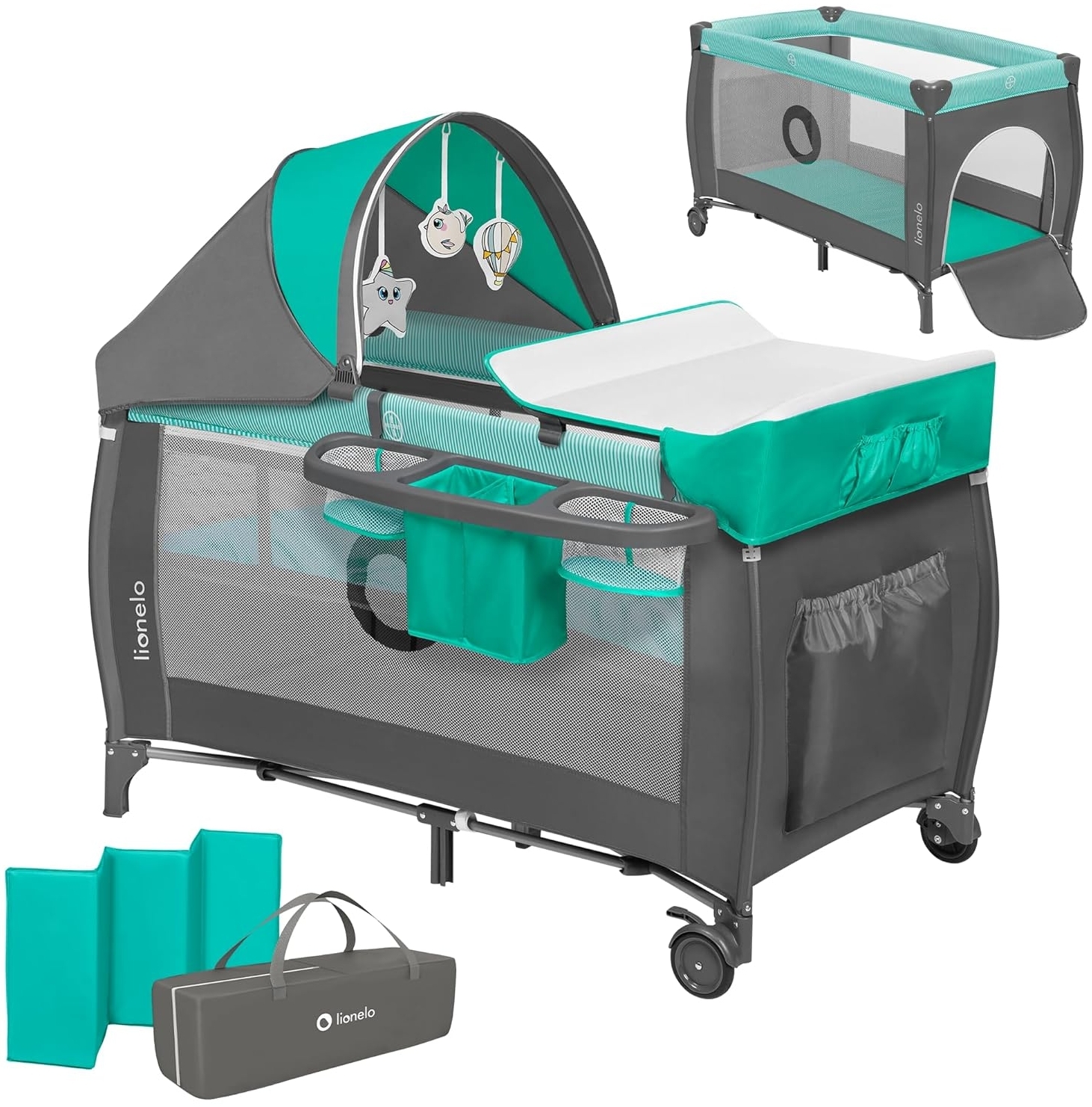 | Name | Lionelo Sven Plus 2 in 1 Baby Bett Laufstall Baby ab Geburt bis 15 kg Wickelauflage Moskitonetz luftige Seitenwände mit Seiteneingang Tragetasche zusammenklappbar (Türkis-Grau) |