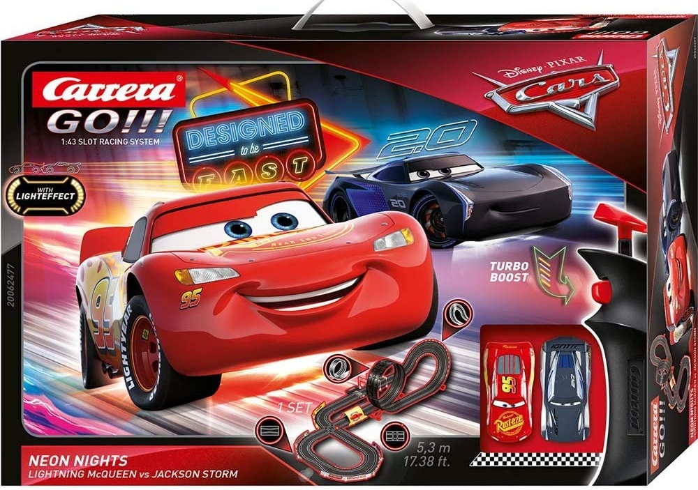 | Name | Carrera 20062477 GO!!! 'Disney Pixar Cars Neon Lights', Autorennbahn-Set, für 2 Spieler, 5,3 Meter Streckenlänge, Ab 6 Jahren, mit Lightning McQueen & Jackson Storm Spielzeugautos |