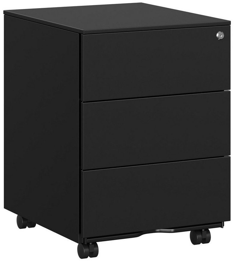 **Artikelbeschreibung:** 1. ALLES AN EINEM PLATZ: Wenn auf Ihrem Tisch im Arbeitszimmer oder Büro stets Chaos herrscht, wird dieser Rollcontainer mit 3 Schubladen Ihnen helfen, Ordnung zu schaffen und Ihr Arbeitsleben zu vereinfachen. Der Schrank verfügt zudem über einen abnehmbaren Organizer, in dem Sie Notizen, Büroklammern etc. verstauen können 2. STÄRKE UND KAPAZITÄT: Ist Ihr Büro Ihr zweites Zuhause? Die Stahlkonstruktion dieses Aktenschranks ist stabil genug, um all Ihre Dokumente und Büroutensilien unterzubringen; jede Schublade ist mit bis zu 15 kg belastbar 3. KOMPLETTES ÖFFNEN SOWIE SCHLIEßEN: Die robusten Vollauszüge ermöglichen es Ihnen, die Schubladen vollständig herauszuziehen, und geben ihnen einen stabilen Halt. Das hochwertige Schloss schützt die im Schrank verstauten Gegenstände ferner vor fremden Händen 4. BEREITS VORMONTIERT: Dieser Büroschrank wird vormontiert geliefert, sodass Sie keine Zeit für eine komplizierte Montage verschwenden müssen. Entscheiden Sie lediglich, ob Sie die 4 Räder (2 mit Bremse) anbringen wollen oder nicht 5. NOCH NICHT ZUFRIEDEN? Unser Kundenservice steht Ihnen jederzeit zur Verfügung. Überlegen Sie also nicht lange und holen Sie sich diesen Rollcontainer, um mehr Stauraum in Ihrem Büro zu schaffen! **Beschreibung:** Egal ob Sie zu Hause oder im Büro arbeiten, ein ordentlicher Arbeitsplatz hat einen großen Einfluss auf Ihre Konzentration und Produktivität. Durch diesen Aktenschrank mit 3 Schubladen von SONGMICS schaffen Sie Ordnung an Ihrem Arbeitsplatz und optimieren gleichzeitig Ihre Arbeitszeit. **Robust und praktisch:** Dokumente, Schreibwaren, persönliche Gegenstände, alles, was Sie bei der Arbeit benötigen, findet einen eigenen Platz in diesem Rollcontainer. Jede der 3 großen Schubladen ist mit bis zu 15 kg belastbar und die Vollauszüge sorgen für mehr Komfort, wenn Sie die Schubladen öffnen sowie schließen. Die Stahlkonstruktion ist ferner so stabil, dass Sie diesen Aktenschrank über viele Jahre hinweg nutzen können. **Wichtige Details:** Machen Sie sich keine Sorgen, wenn Sie diesen Schrank unbeaufsichtigt lassen! Das hochwertige Schloss schützt Ihre Akten vor neugierigen Blicken und Kinderhänden. Schieben Sie diesen Rollcontainer einfach an die gewünschte Stelle, wenn Sie beispielsweise gerne im Wohnzimmer arbeiten. Ein treuer Begleiter, welcher Ihnen jederzeit zur Verfügung steht! Suchen Sie nach einer praktischen, geräumigen Kommode, um Ihr Arbeitsleben zu vereinfachen? Ihre Suche ist beendet, denn Sie haben sie schon gefunden! **Abschließbar** So können Sie wichtige Dokumente auch in für jedermann zugänglichen Büros sicher aufbewahren. Wenn Sie zu Hause arbeiten, schützt das Schloss Ihre Akten vor Kinderhänden. **Kann überallhin gerollt werden** Dieser Schrank verfügt über 4 Rollen, 2 davon arretierbar, sodass Sie ihn an jede beliebige Stelle schieben oder ihn immer an seinem Platz stehen lassen können. **3 geräumige Schubladen** In diesen 3 Schubladen können Sie eine große Menge an Akten verstauen. So werden Ihre Anforderungen an die Aufbewahrung von Dokumenten erfüllt. **Produktdetails:** - Farbe: Mattschwarz - Material: Stahl - Größe: 39 x 45 x 55 cm (L x B x H) - Gewicht: 16 kg - Max. Belastbarkeit jeder Schublade: 15 kg **Lieferumfang:** - 1 x Rollcontainer mit 3 Schubladen - 1 x Zubehörbeutel - 1 x Anleitung (DE, EN, IT, FR, ES)