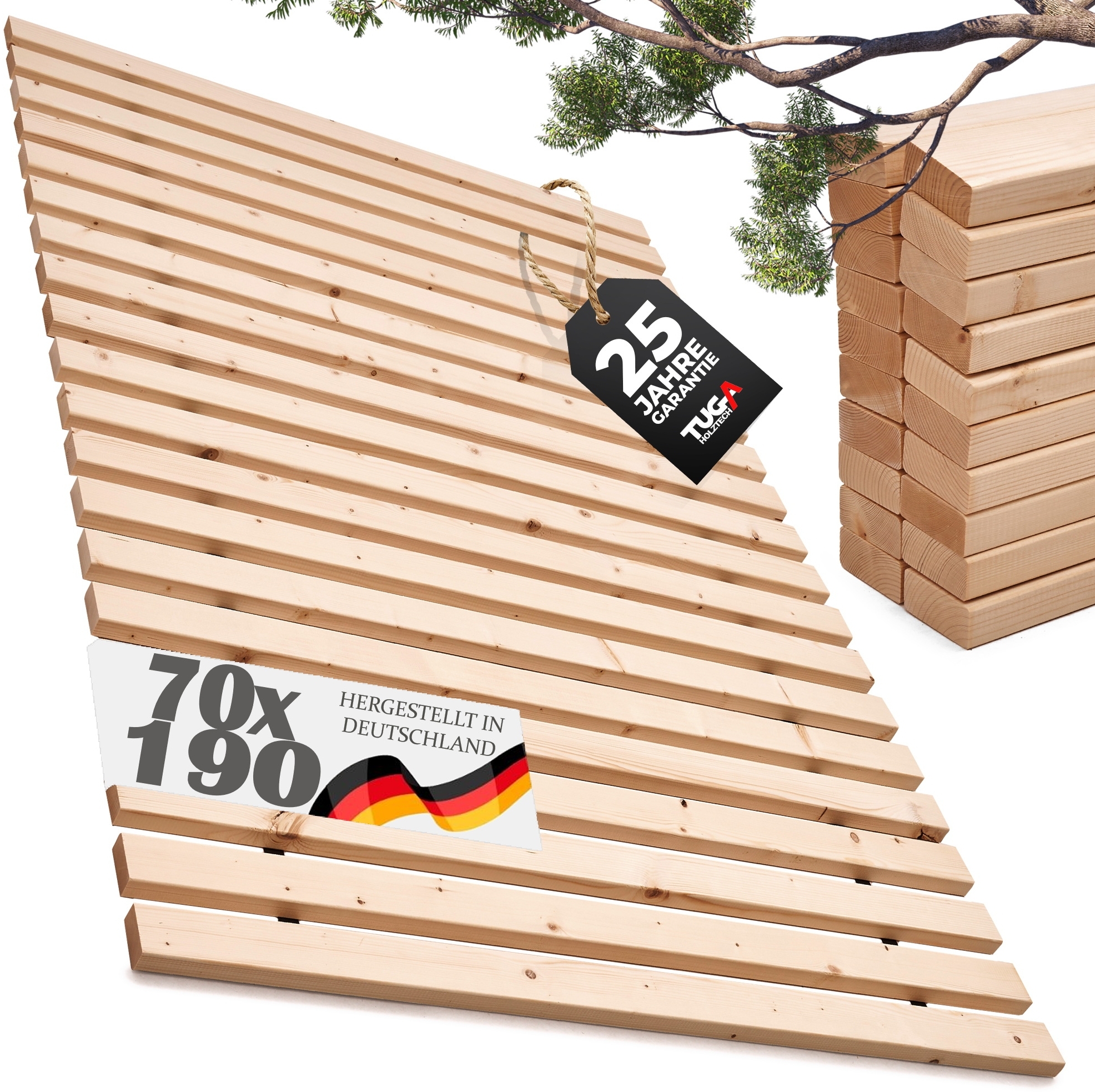 ## 30mm Kraft-Schorsch ### Produktbeschreibung Ein nicht formstabiler Rost lässt den Körper in eine Kurvenposition sinken, was auf Dauer zu Rückenproblemen, Schlafstörungen und Gelenkbeschwerden führen kann. Wir haben mit maximaler Leistenstärke 30mm (max bis 500 Kg Flächenlast) die nötige Stabilität. Die gebotene Leistenanzahl bei starren Rolllattenrosten bietet zudem für eine überdurchschnittliche Belüftung Ihrer Matratze. Der harte Unterbau sorgt für ausgeglichene Gewichtsverteilung und verhindert die einseitige Belastung. Bei stabilen Matratzenauflagen liegt der Körper gerade und wird überall gleich gestützt. Die Matratze sollte allerdings weich genug sein und eine ausreichende Stärke je nach Körpergewicht haben, um Schultern und Hüften bequem liegen zu lassen. Unsere formstabilen Lattenroste sind auch bestens geeignet für alle Arten von Matratzen, zeigen auch nach Jahren keine Ermüdungserscheinungen, EXTRA STARKE LEISTEN 30mm. Solide verarbeiteter Rollrost gemäß unserem Motto NICHT Quantität sondern Qualität... Ihr Schlaf liegt uns am Herzen **LINK** " hier geht`s zum Video" **LINK zum Langzeittest** " hier geht`s zum Video " Wir verbringen immerhin ein Drittel unseres Lebens im Bett, sparen sie hier nicht an der Qualität! ### Details * durchlaufende Leisten bzw. Lamellen in der angegebenen Größe, einbaufertig * auf reisfestem Gurtband gefertigt, zu vergleichen mit der Qualität von Rolladengurten * Matratzeneignung Bett1 Bodygard Emma Matratzenarten Kaltschaum-, Tonnentaschenfederkern- oder Viscomatratzen * die ideale stabile Unterlage für Ihren gesunden Schlaf in der Kombination mit einer hochwertigen Matratze * Belastung ausgelegt von 0 bis 500Kg Flächenlast * Gurtbandfarbe wird nach Verfügbarkeit verwendet und ist nicht wählbar * Ihr Bett muss für die Verwendung von Rollrosten mit durchlaufenden seitlichen Auflagen- bzw. Mittelleiste ab 140cm Breite ausgestattet sein, gerne auch zum Nachrüsten direkt über uns erhältlich ### Material und Behandlung * unbehandeltes Natur – Vollholz sauber 4 seitig gehobelt softgerundete Kanten auf Gurtband befestigt * Naturholz frei von Behandlungen ### Maße * Liegefläche nach Auswahl oben * Aufbauhöhe nur 30mm * Leistenbreite 68mm * Lamellenanzahl 20 Stück bei 200cm Länge, 22 Stück bei 220cm ### Bitte beachten: * Für die Breite von 140 cm ist bis 150Kg KEINE Mittelleiste im Bettgestell notwendig * Das Längenmaß ist um ca 5-6cm kürzer um im Kopf- und Fußbereich eine Hinterlüftung zu gewährleisten * Untermaß: z.B. Bettgröße 140 x 200 entspricht einer Lamellenlänge von ca. 139,5 cm (140 cm - 5 mm Untermaß) * Wenn Sie die seitlichen bzw. mittlere Auflageleisten benötigen, finden Sie diese bei uns im Shop * Unsere Bewertungen unterstreichen die bei uns gefertigte Qualität * Bitte kontrollieren Sie vor dem Kauf Ihr Bett auf Maßhaltigkeit und Passform, gerne stehen wir Ihnen auch bei Fragen zur Seite ### Lieferumfang * einlegefertiger starrer Naturholzrollrost unbehandelt in Ihrer Auswahlgröße auf Gurtband befestigt * Dekoration sowie Matratze sind NICHT im Lieferumfang enthalten Garantiebedingungen ### Wissenswertes Federnde Leisten verfälschen die Eigenschaften Ihrer guten Matratze gleich ob Sie Tempur, Latex, Kaltschaum, Federkern oder die Emma-Matratze bevorzugen, getestet wurde die Bodygard von Bett1 in Verbindung mit einem stabilen Unterbau den unsere Roll- und Lattenroste bieten. Ungleichmäßige Bewegungen zwischen Federleisten und Matratze sorgen zudem noch zu Abnutzungen beider und wirken im schlimmsten Fall gegen die Eigenschaften einer guten Matratze. Alle Holzbauteile haben ihre natürliche Farbgebung, sind unlackiert und damit frei von Schadstoffen. Es handelt sich um unbehandeltes Massivholz Hergestellt in Deutschland aus nachhaltiger Forstwirtschaft. Direkt und nur aus dem Hause von TUGA-Holztech, Sie erhalten eine Rechnung mit ausgewiesener Umsatzsteuer! ### Service: Sollte etwas nicht zu Ihrer Zufriedenheit, oder von unserer Seite aus ein Fehler passiert sein, dann möchten wir Sie bitten, dass Sie nicht sofort negativ reagieren. Bitte geben Sie uns die Möglichkeit gemeinsam mit Ihnen eine Lösung zu finden ### Unser Motto Bei uns zählt nicht Quantität sondern Qualität, denn die Freude über einen günstigen Preis währt meist nicht so lange, wie der Ärger über schlechte Qualität.
