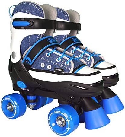 Die hochwertigen Best Sporting Rollerskates lassen sich jeweils in vier Schuh-Größen verstellen. Die ABEC 7 Carbon-Kugellager und die 82 A PU-Rollen sorgen für eine optimale Kraftübertragung. Die Polsterung aus Memory-Foam und die qualitativ hochwertigen EVA Innensohlen sorgen für besten Tragekomfort. Beidseitige Sicherheitsverschlüsse sorgen für einen hervorragenden Halt, ein leichter Einstieg wird ermöglicht durch eine Zusatz-Schlaufe im Knöchelbereich. Diese Quad-Style Rollschuhe mit hervorragender Passform und Stabilität sind in folgenden Größenvarianten erhältlich, die sich mittels eines seitlichen Druckknopfes jeweils in 4 Schritten individuell in der Größe einstellen lassen: Schuhgröße 28 - 31 (max. Benutzergewicht 20 kg - 60 kg), Schuhgröße 32 - 35 (max. Benutzergewicht 20 kg - 60 kg), Schuhgröße 36 - 39 (max. Benutzergewicht 20 kg - 100 kg). Achtung: Mit Schutzausrüstung zu benutzen. Nicht im Straßenverkehr zu verwenden. Farbe: blau-weiß, Schuhmaterial: Kunstleder mit Zehenkappe aus Nylon, Rollen: 58 x 33mm, 82 A, Memory-Foam und EVA Innensohle, Rollen aus PU, casted wheels, PP High Impact Chassis und Truck PP Schale + Cuff PU Stopper, seitliches Druckknopfsystem, beidseitiger Sicherheitsverschluß (double end security lock), Lieferumfang: 1 Paar Rollschuhe Nutzergewicht: Max. 100 kg. Achtung: Mit Schutzausrüstung zu benutzen. Nicht im Straßenverkehr zu verwenden.