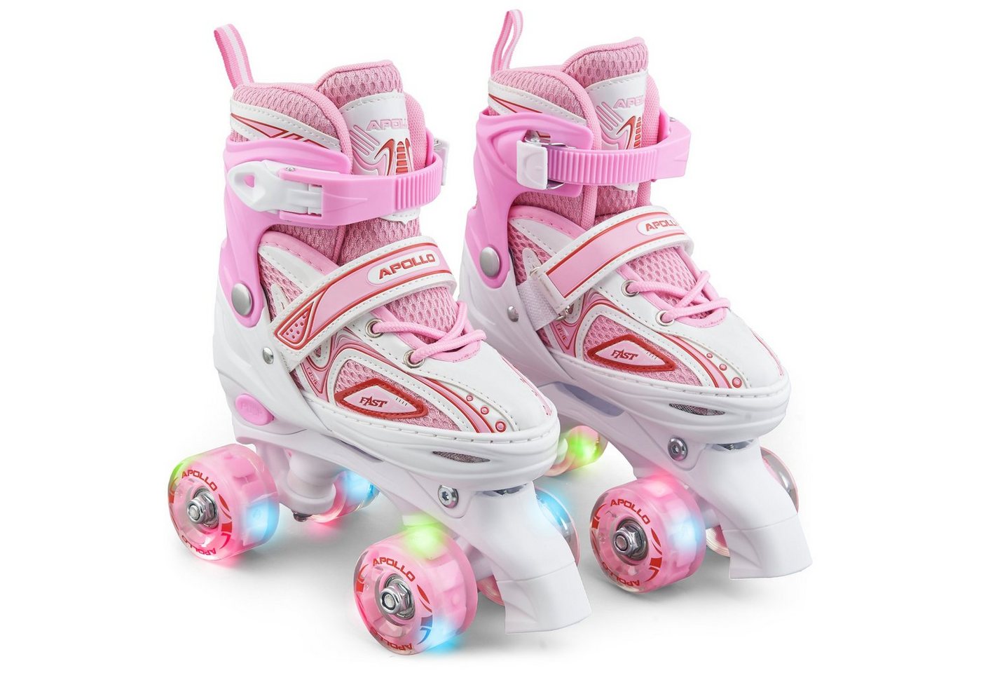 Die Apollo Rollschuhe sind größenverstellbar, gut verarbeitet und bieten eine ansprechende Optik. Die leuchtenden Rollen sind ein zusätzlicher Pluspunkt. Sie sind einfach anzuziehen und bieten ein angenehmes Fahrgefühl, jedoch kann das Bremsen schwieriger sein als bei Inline Skates. Der Verschluss am Knöchel könnte ebenfalls problematisch sein.