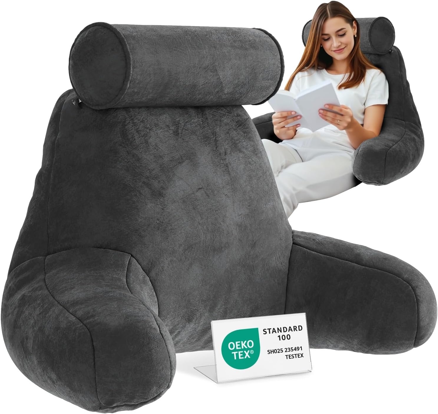 Rückenkissen mit Armlehnen und Nackenrolle für optimalen Sitzkomfort. Das XXL-Rückenkissen bietet formstabilen Halt für Rücken und Arme und eignet sich hervorragend zum Lesen, Fernsehen oder Entspannen. Die abnehmbare Nackenrolle sorgt für zusätzlichen Komfort, während die individuell anpassbare Füllung den gewünschten Halt bietet. Ein praktisches Seitenfach ermöglicht die Aufbewahrung von Fernbedienung und Smartphone. Der kuschelweiche, waschbare Bezug ist in Grau erhältlich. Maße: 41 x 38 x 61 cm. **Highlights** - Formstabiler Halt für Rücken und Arme - Abnehmbare Nackenrolle für zusätzlichen Komfort - Individuell anpassbare Füllung für optimalen Halt - Praktisches Seitenfach für Fernbedienung und Smartphone - Einfacher Transport dank integriertem Tragegriff **Produkteigenschaften** - Rückenkissen mit Armlehnen - Abnehmbare Nackenrolle - Füllung aus formstabilem Schaumstoff - Kuschelweicher, waschbarer Bezug - Inkl. Steckfach für Mobiltelefon, Fernbedienung u.v.m. - Mit Tragegriff - Farbe: Grau - Maße: 41 x 38 x 61 cm **Lieferumfang** - 1x Rückenkissen XXL mit Armlehnen und Nackenrolle